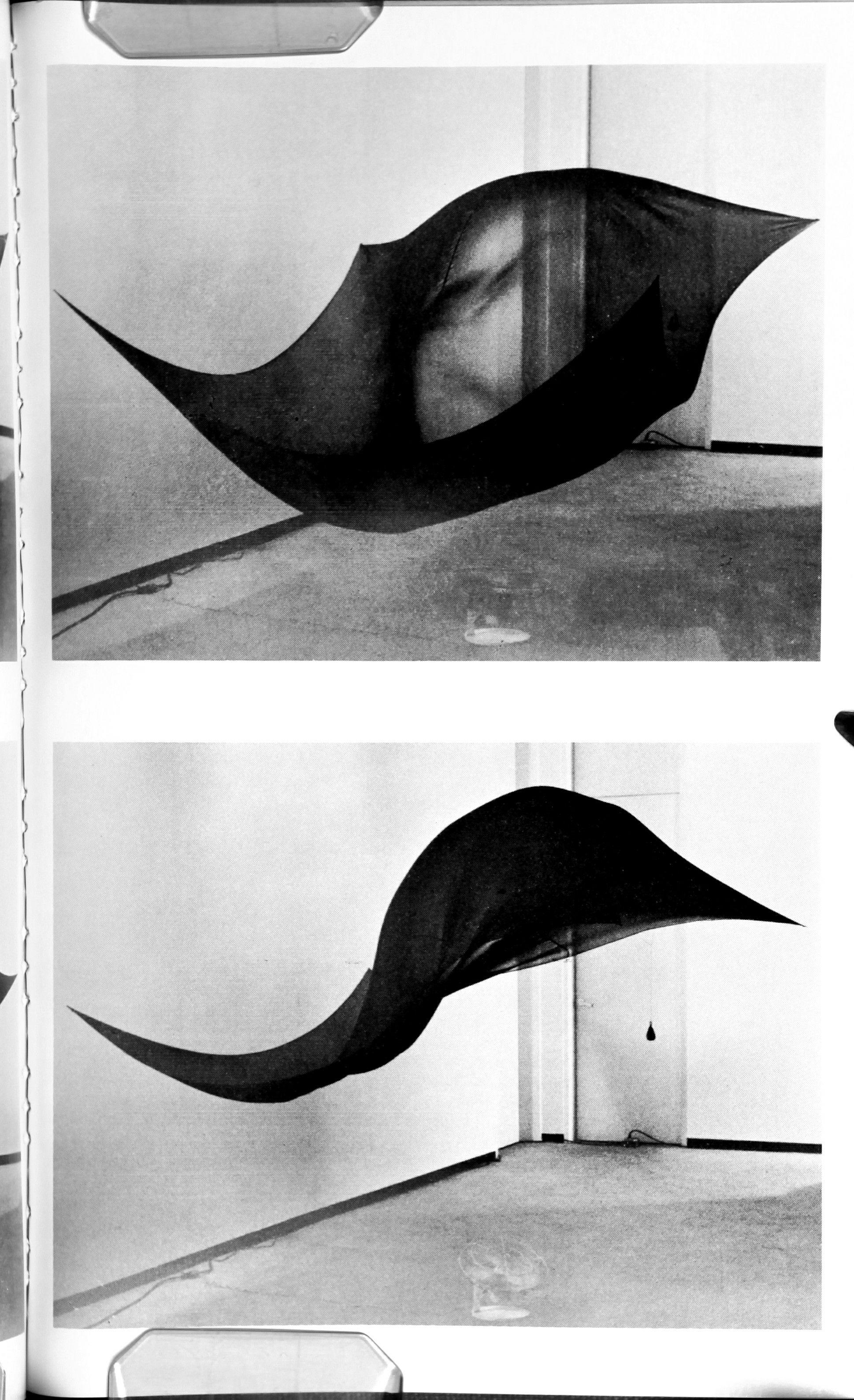 (6) and (7) "Sail Construction" (1965): in this sequence a seven by seven foot blue chiffon cloth is supported above the ground by an air blower directly under it; for Haacke, the flexibility of the "sail" has an almost animal vitality.