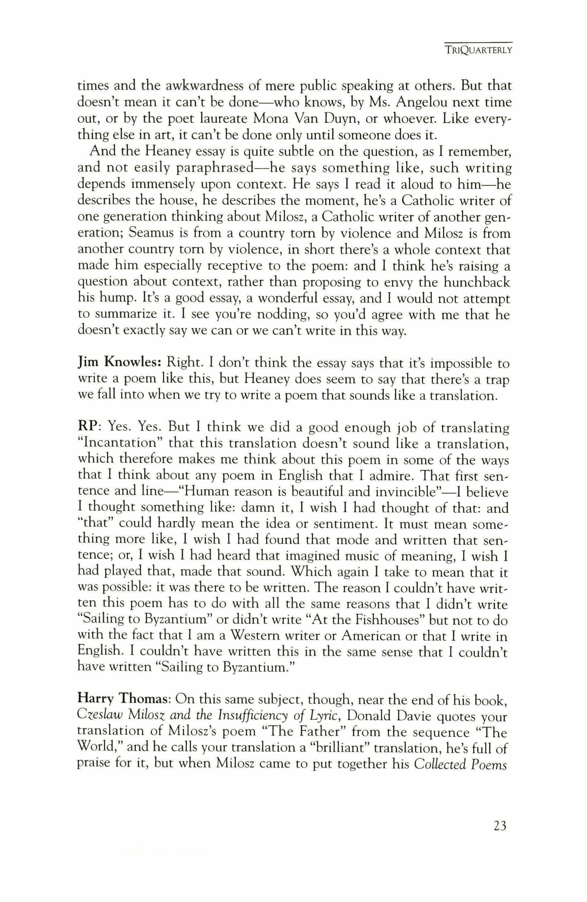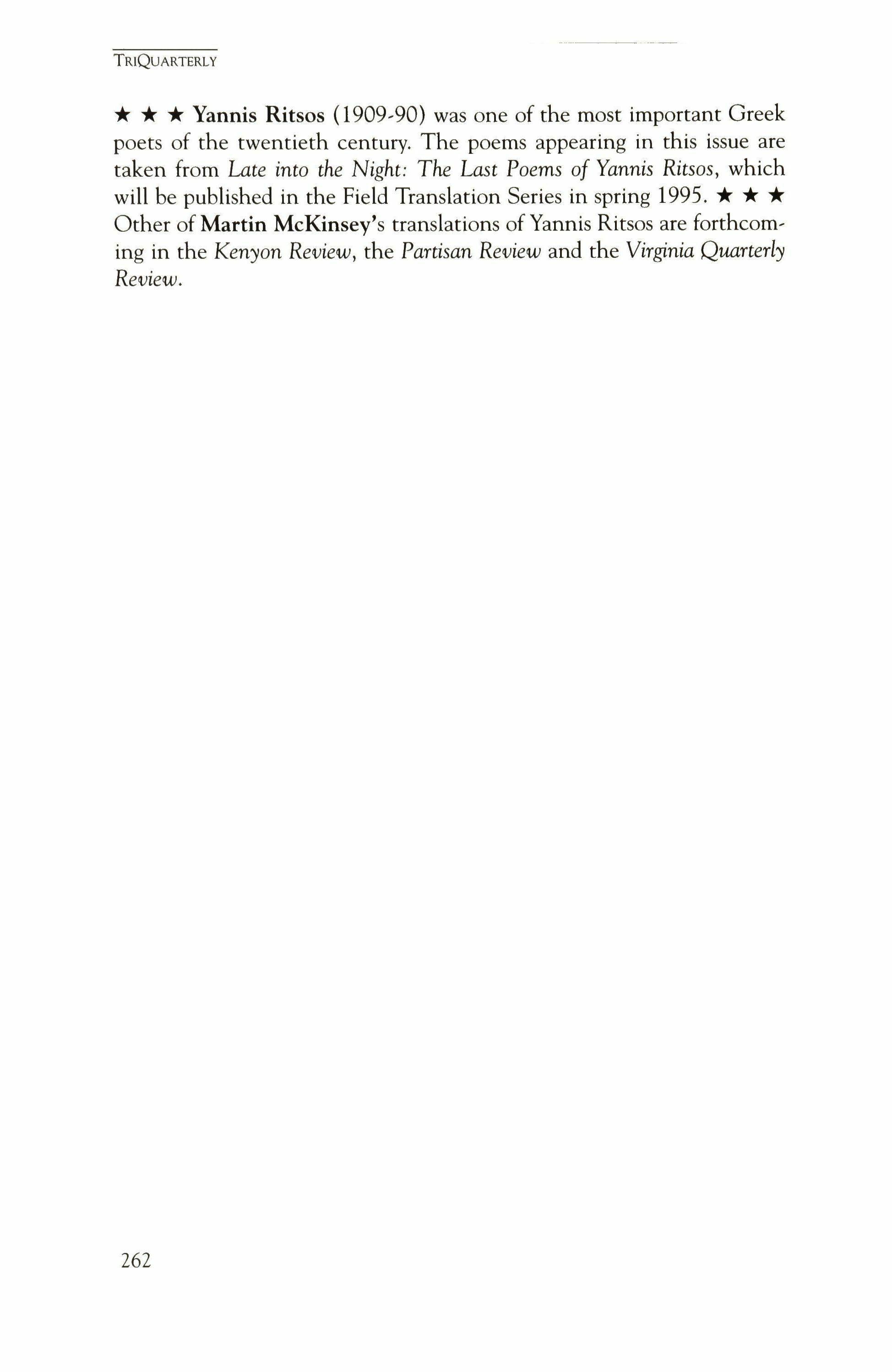 NOTE: TriQuarterly welcomes financial support in the form of donations, bequests and planned gifts. Please write to Reginald Gibbons, editor. Please see the last page and the inside back cover for names of individual donors to TriQuarterly.