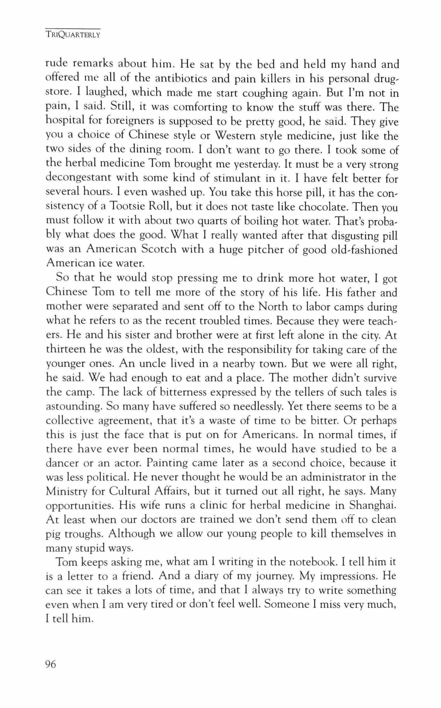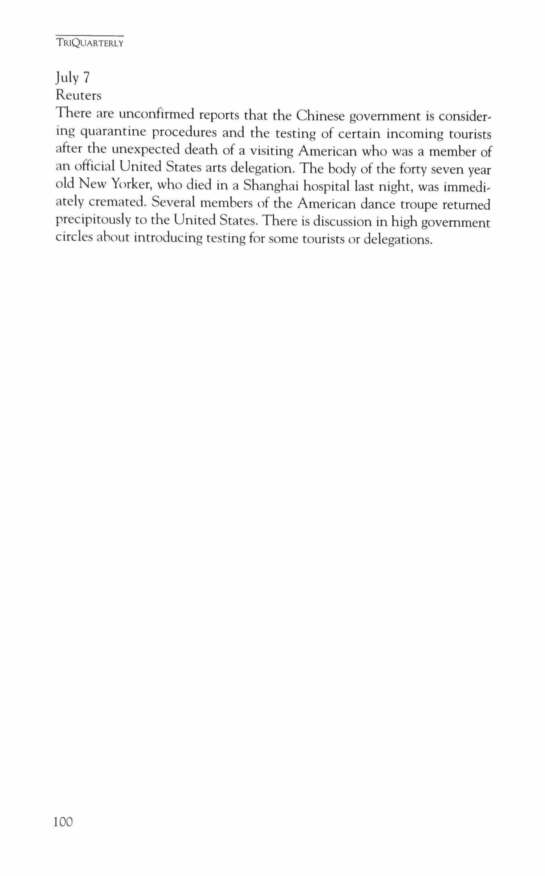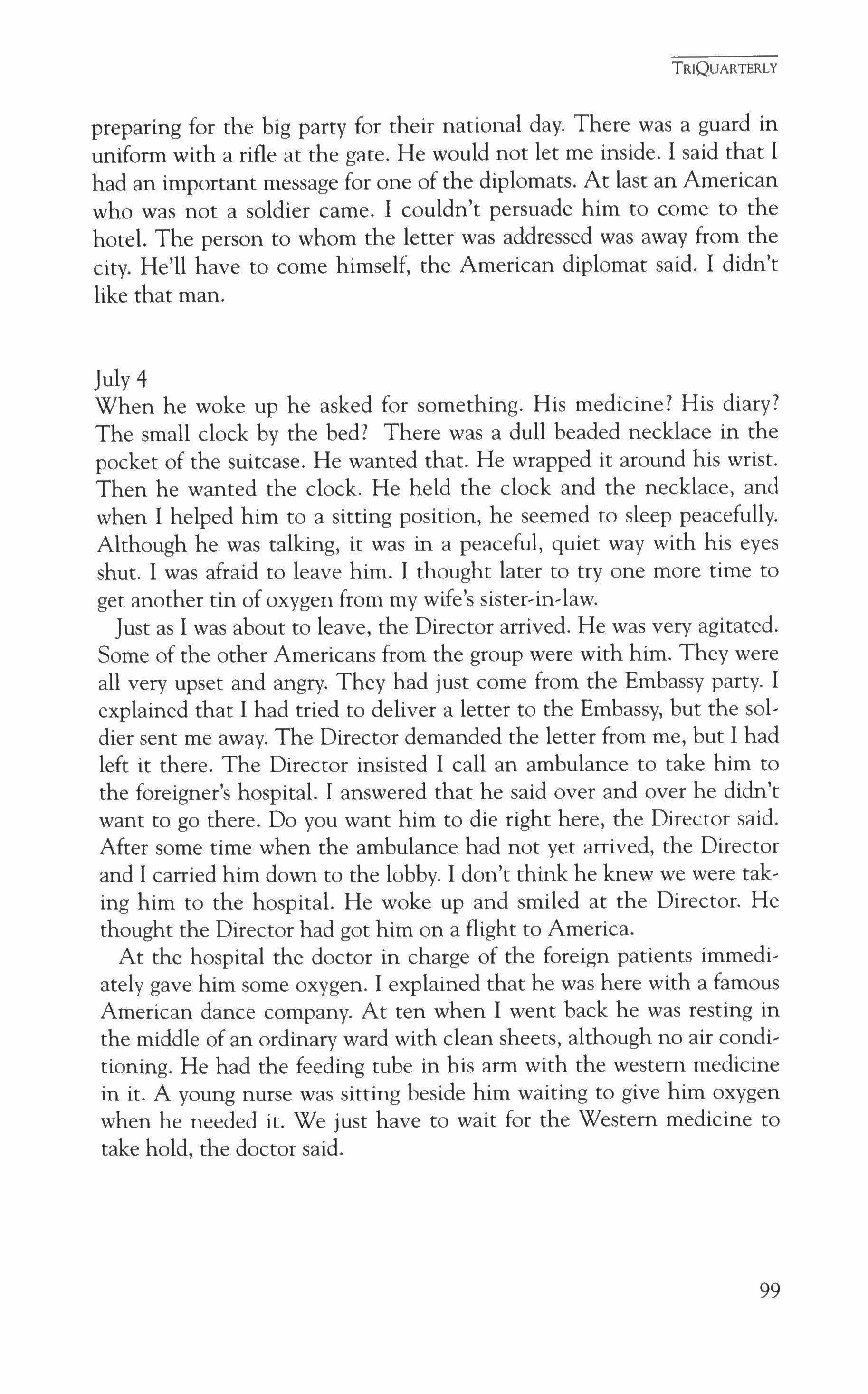 NOTE: TriQuarterly welcomes financial support in the form of donations, bequests and planned gifts. Please write to Reginald Gibbons, editor. Please see the last page and the inside back cover for names of individual donors to TriQuarterly.