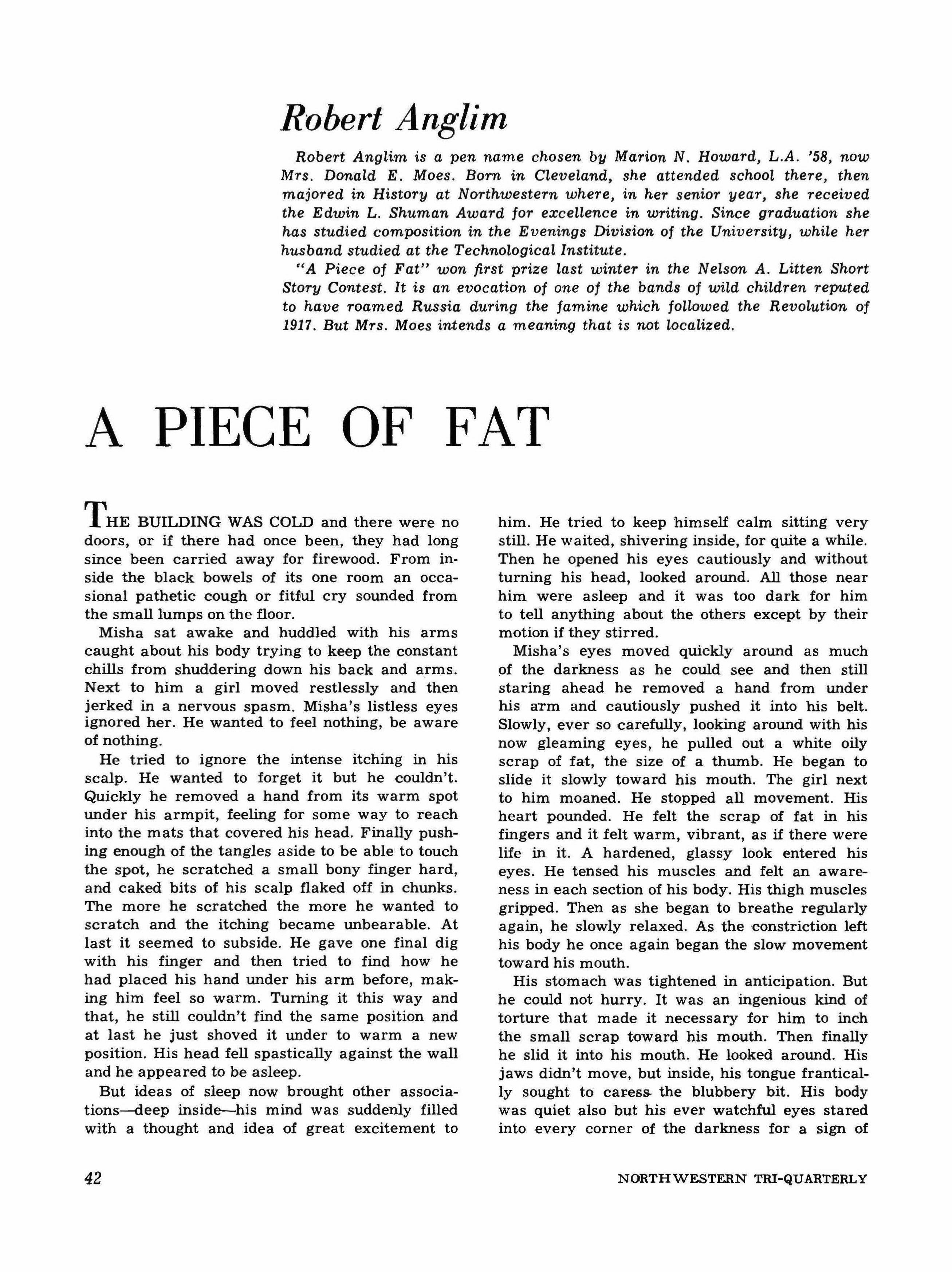 "A Piece of Fat" won first prize last winter in the Nelson A. Litten Short Story Contest. It is an evocation of one of the bands of wild children reputed to have roamed Russia during the famine which followed the Revolution of 1917. But Mrs. Moes intends a meaning that is not localized.