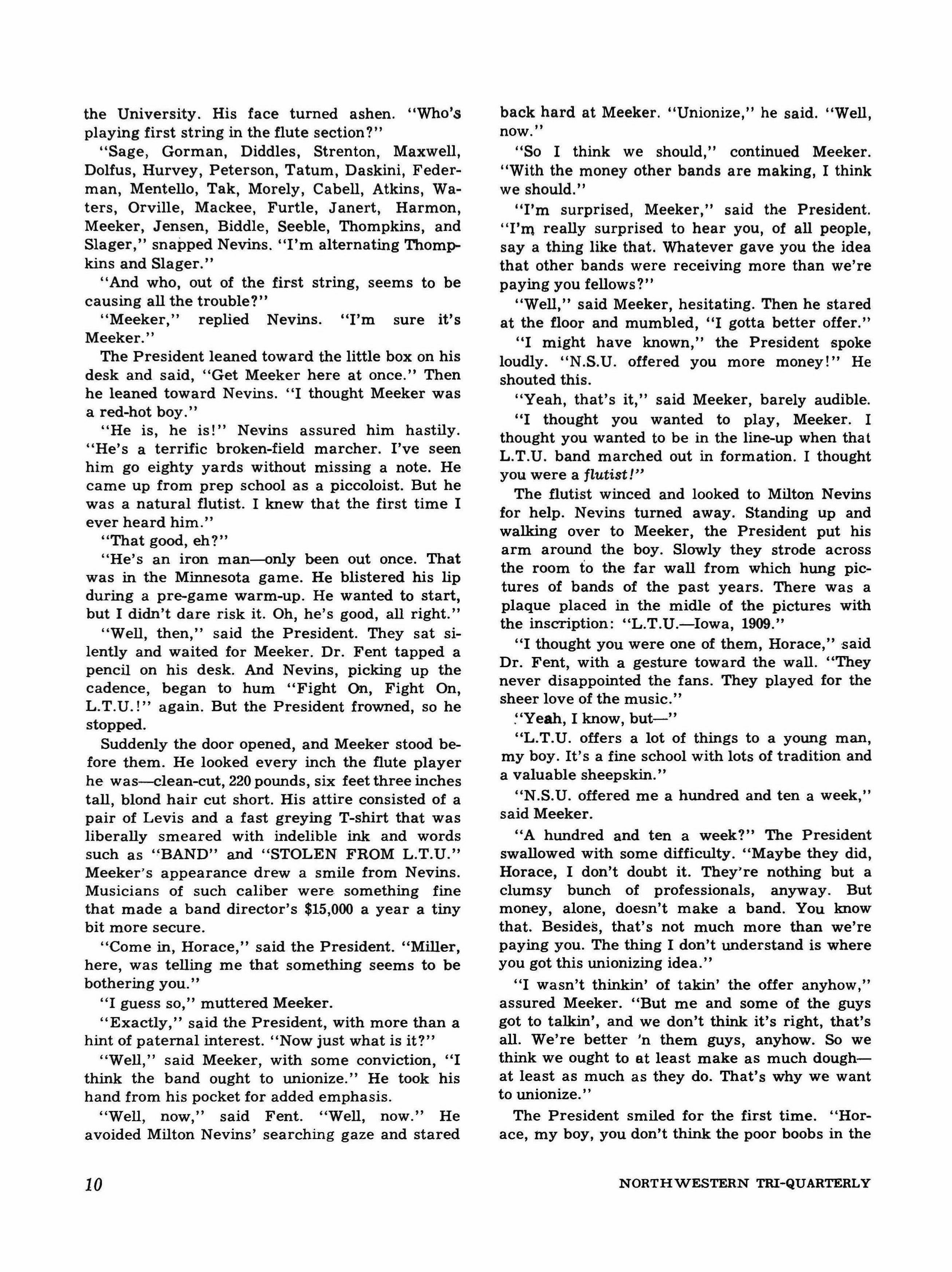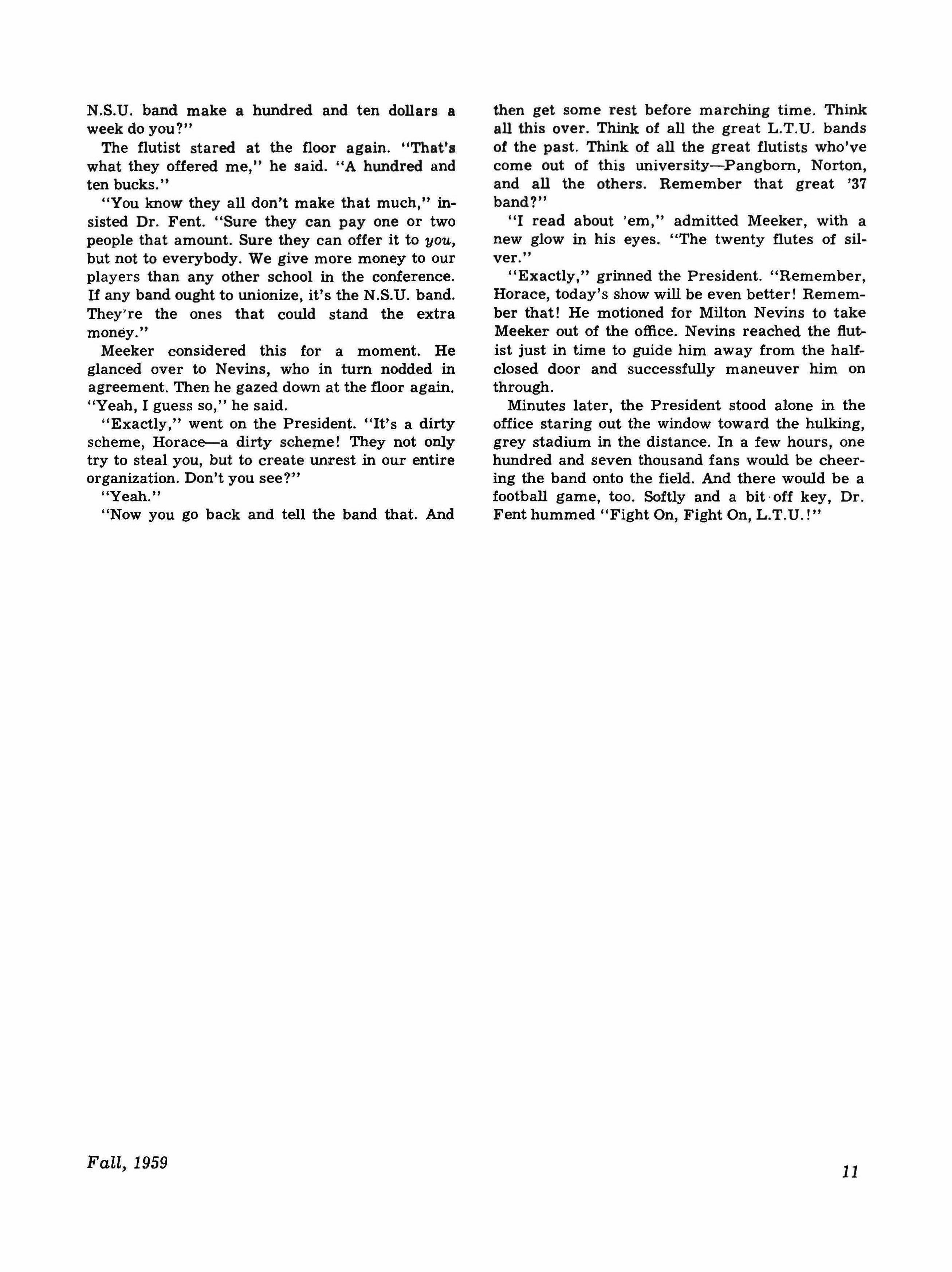 MILTON NEVINS, Director of the University Marching Band, sat nervously outside the President's office and hummed "Fight On, Fight On, L.T.U.!" again and again. Suddenly the buzzer on the secretary's desk buzzed. She spoke secretly and softly into it and then looked at Milton Nevins. "Doctor Fent will see you now," she said. He picked up his briefcase and opened the door to the inner office. "Come in, Nevins," said the President. And when Nevins was inside and had closed the door behind-"Sit down." Nevins sat down. He glanced at the little day-by-day calendar on the President's desk and read the words "Saturday, October 30." Beneath that was written "Homecoming." The last was underlined several times.