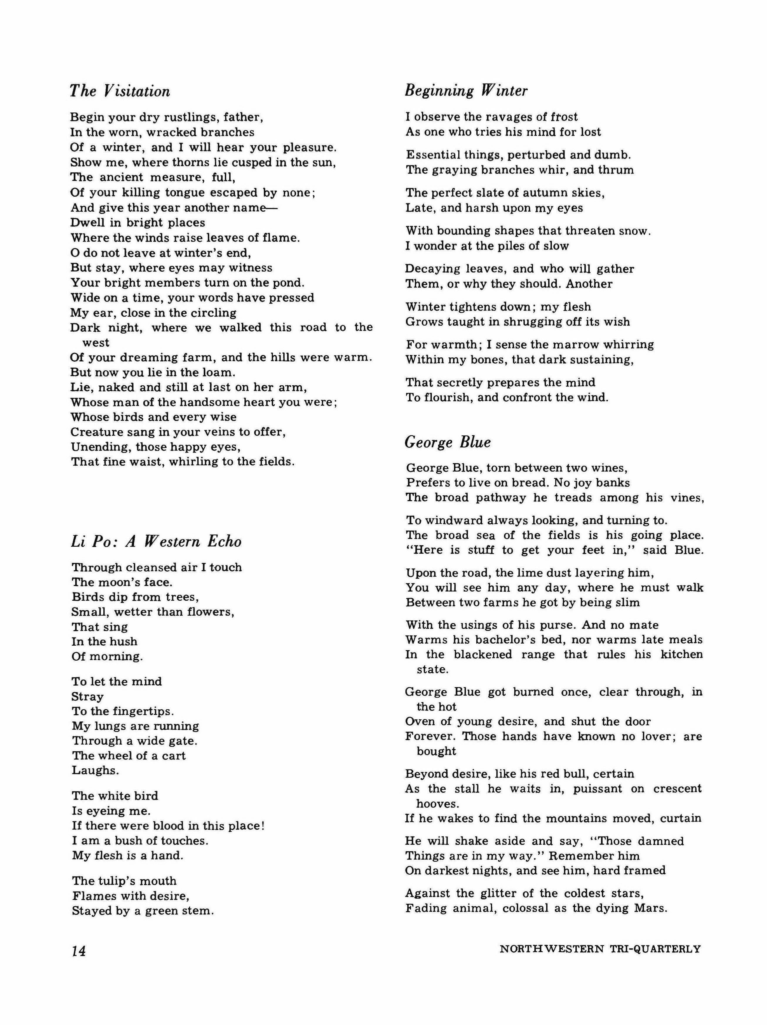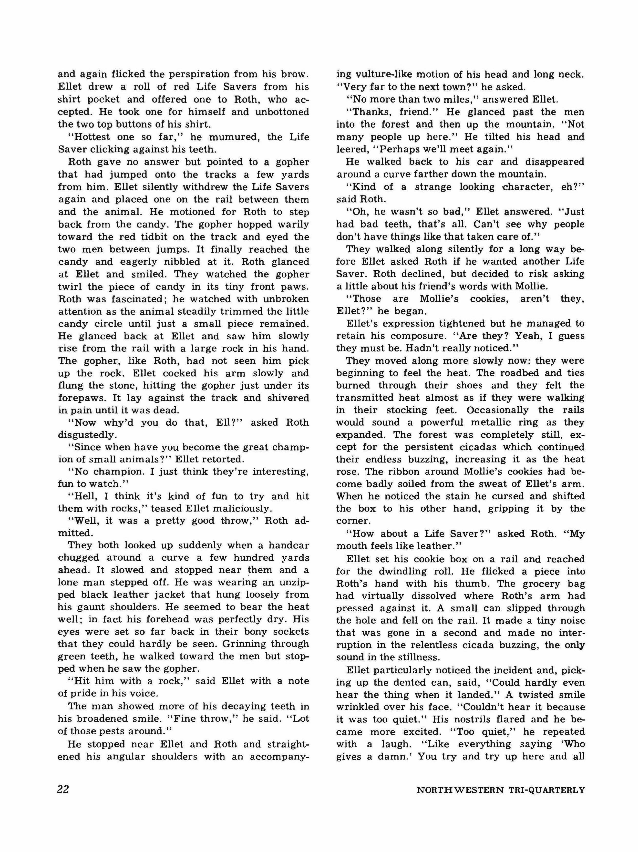 The Tri-QUARTERLY is a magazine devoted to fiction, poetry, and articles of general interest, published in the fall, winter, and spring quarters at Northwestern University, Evanston, Illinois, and printed by Lloyd Hollister Inc., Wilmette, Illinois.
