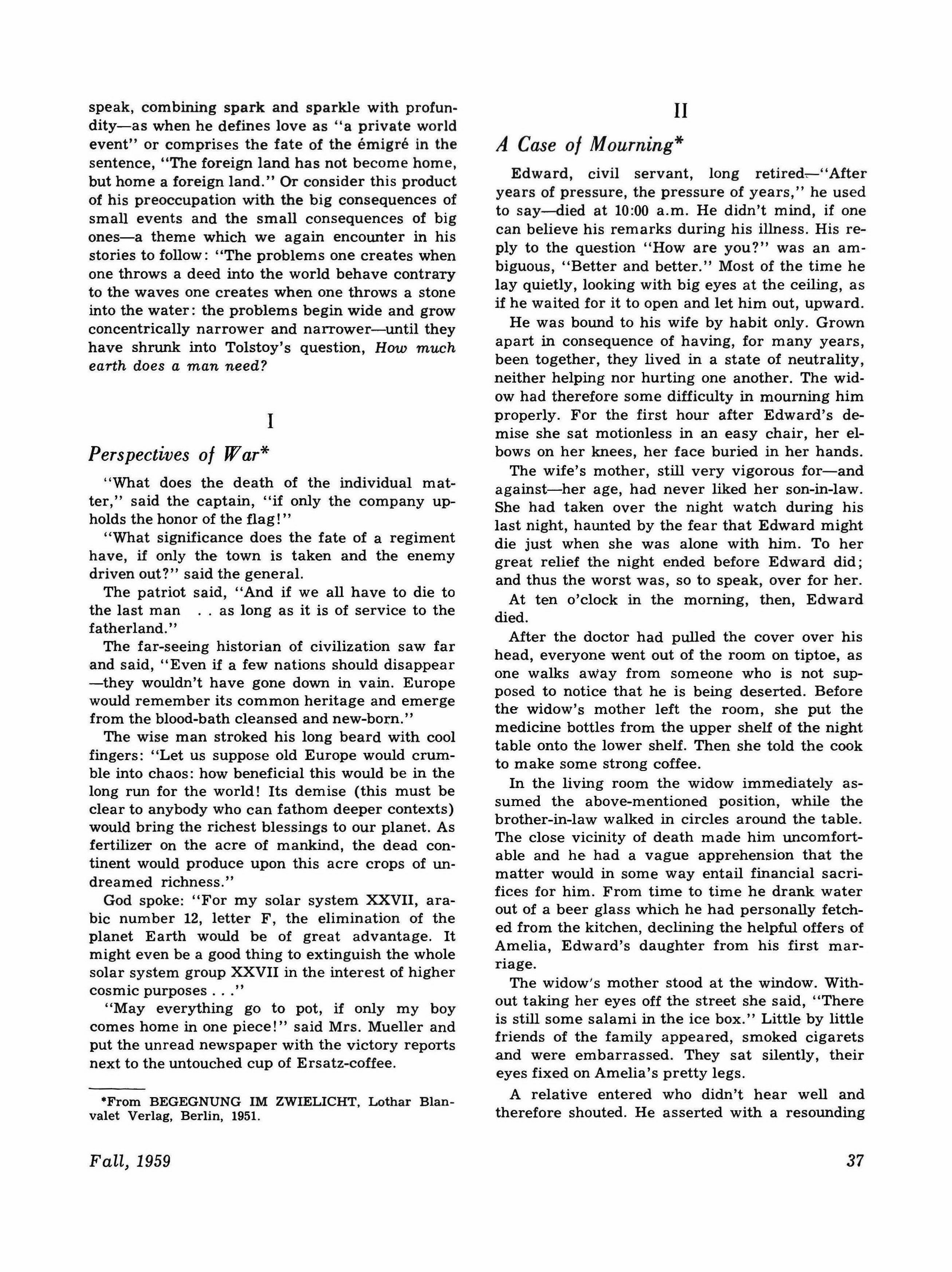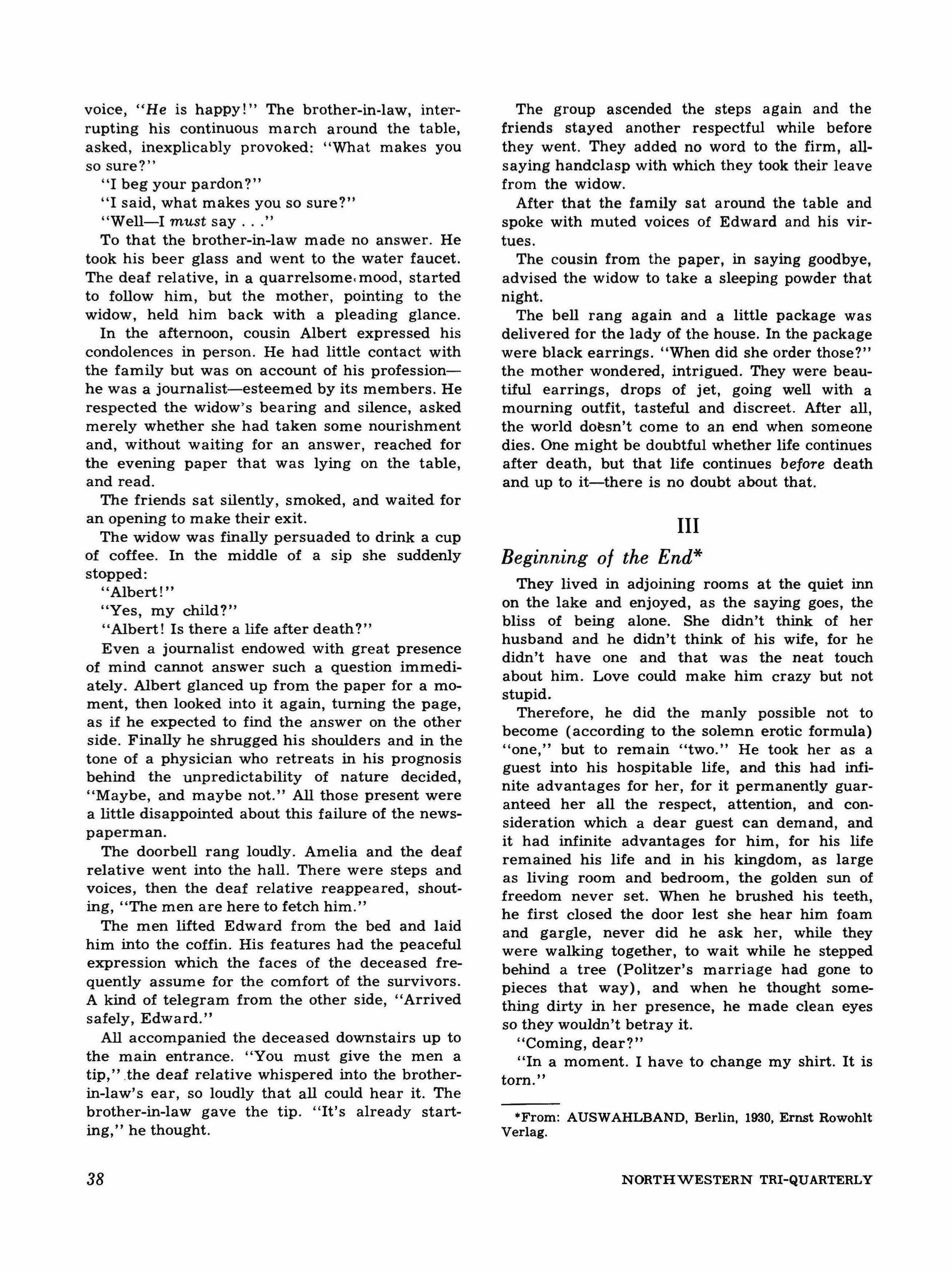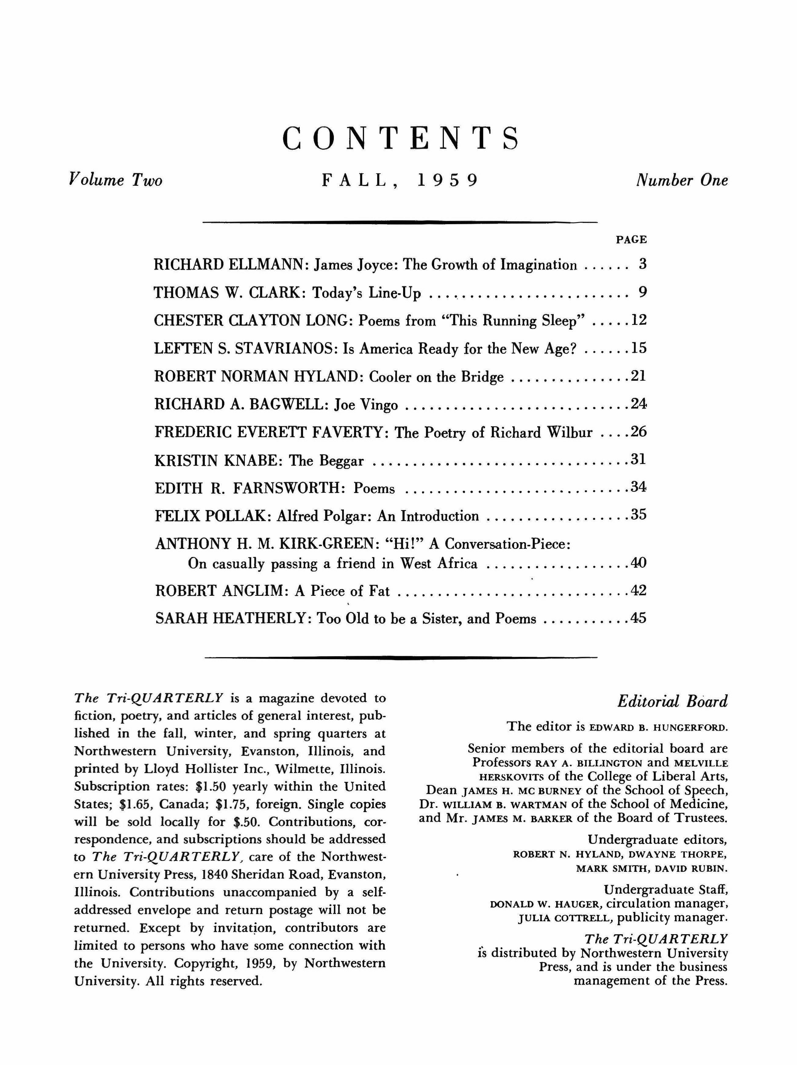 Subscription rates: $1.50 yearly within the United States; $1.65, Canada; $1.75, foreign. Single copies will be sold locally for $.50. Contributions, correspondence, and subscriptions should be addressed to The Tri-QUARTERLY, care of the Northwestern University Press, 1840 Sheridan Road, Evanston, Illinois. Contributions unaccompanied by a selfaddressed envelope and return postage will not be returned. Except by invitation, contributors are limited to persons who have some connection with the University. Copyright, 1959, by Northwestern University. All rights reserved.