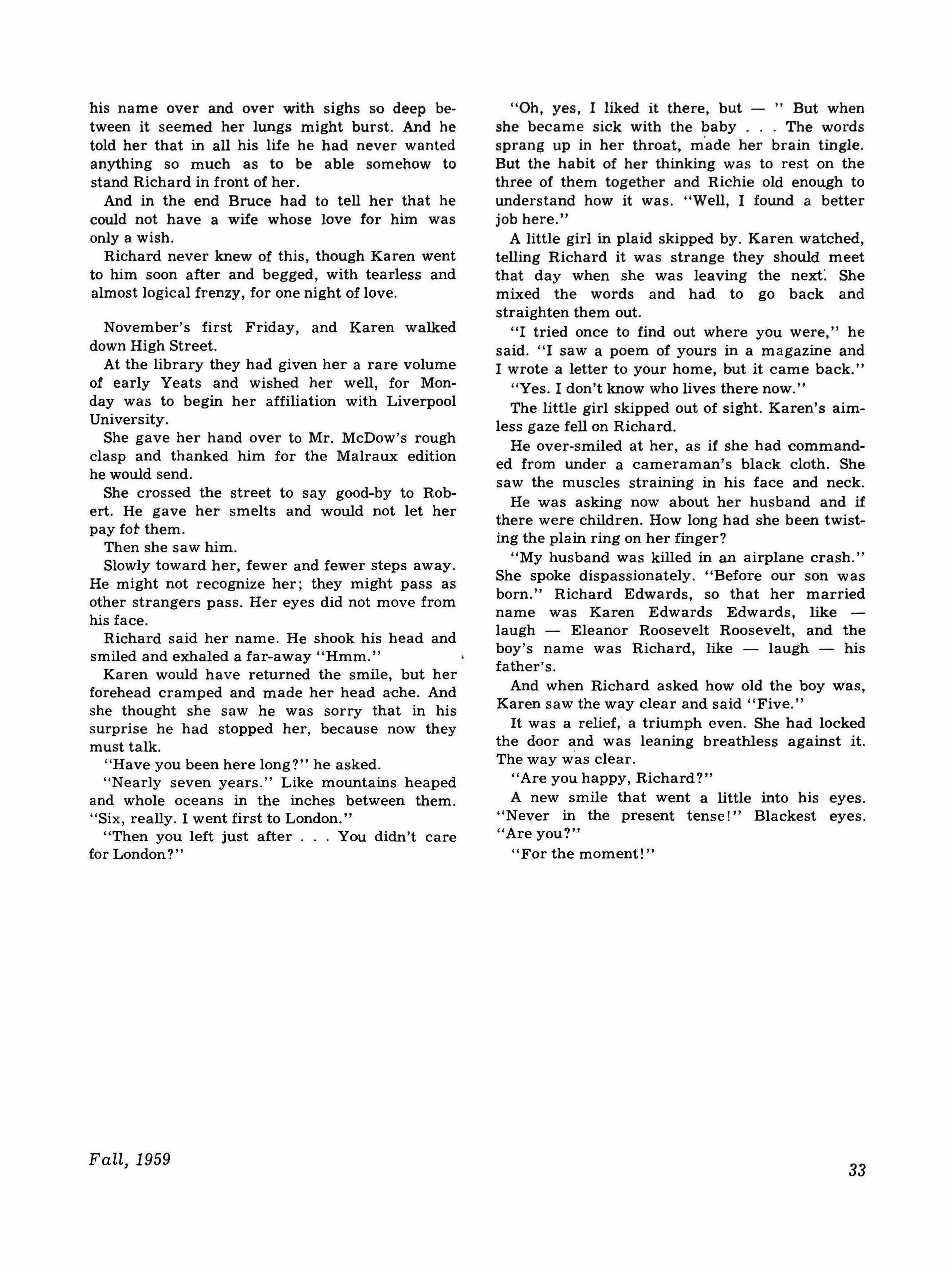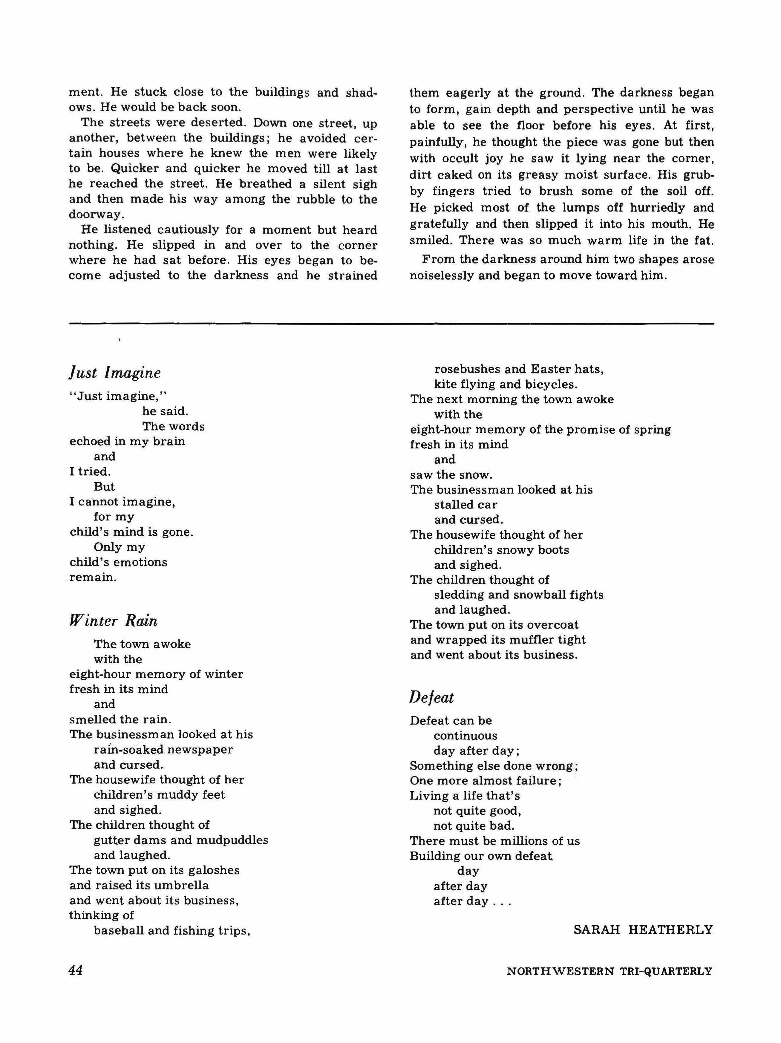 Sarah Heatherly, L.A. '58, now Mrs. Carl S. Lossau, has recently been working in the Documents Room at Deering Library while her husband, engaged in research for the Chicago City Planning Board, completes his work for the Ph.D. degree in Geography. She was born in BrO'l.VTl.sville, Texas, went to school in St. Louis, and majored in English Composition at Northwestern. THE TRIQUARTERLY is pleased to include in this issue three of her poems, which appear on the facing page, as well as her story.