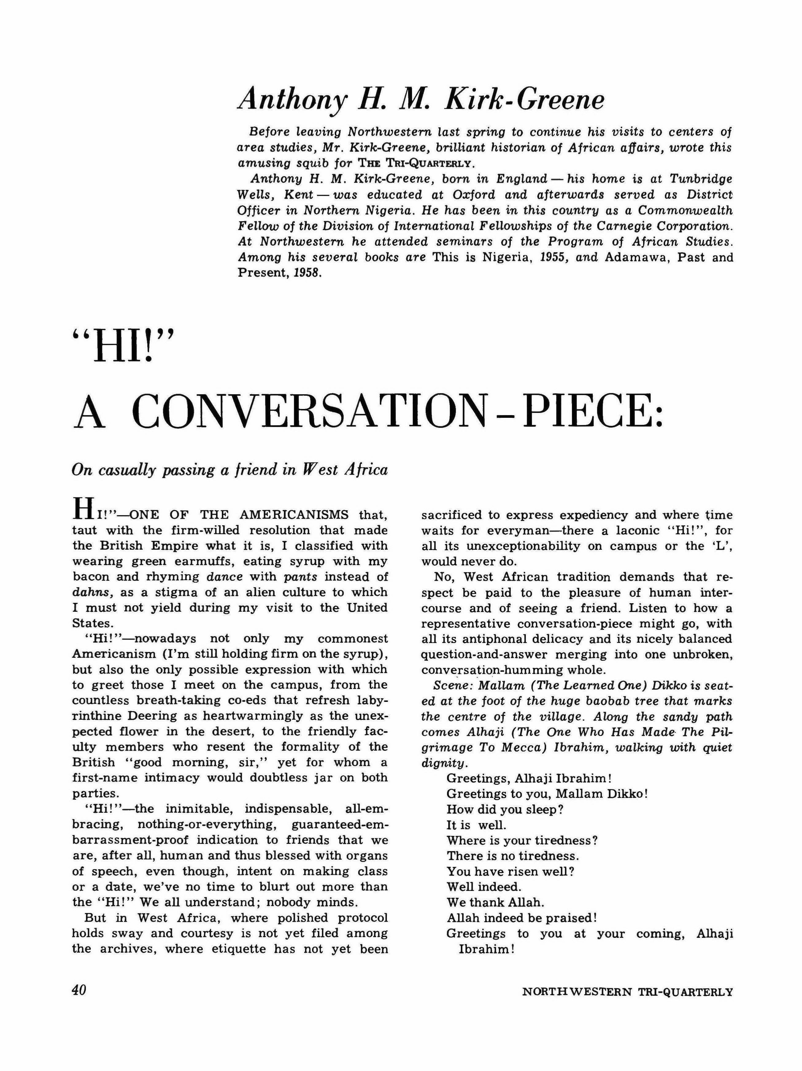 Anthony H. M. Kirk-Greene: "Hi!" A Conversation-Piere: On casually passing a friend in West Africa