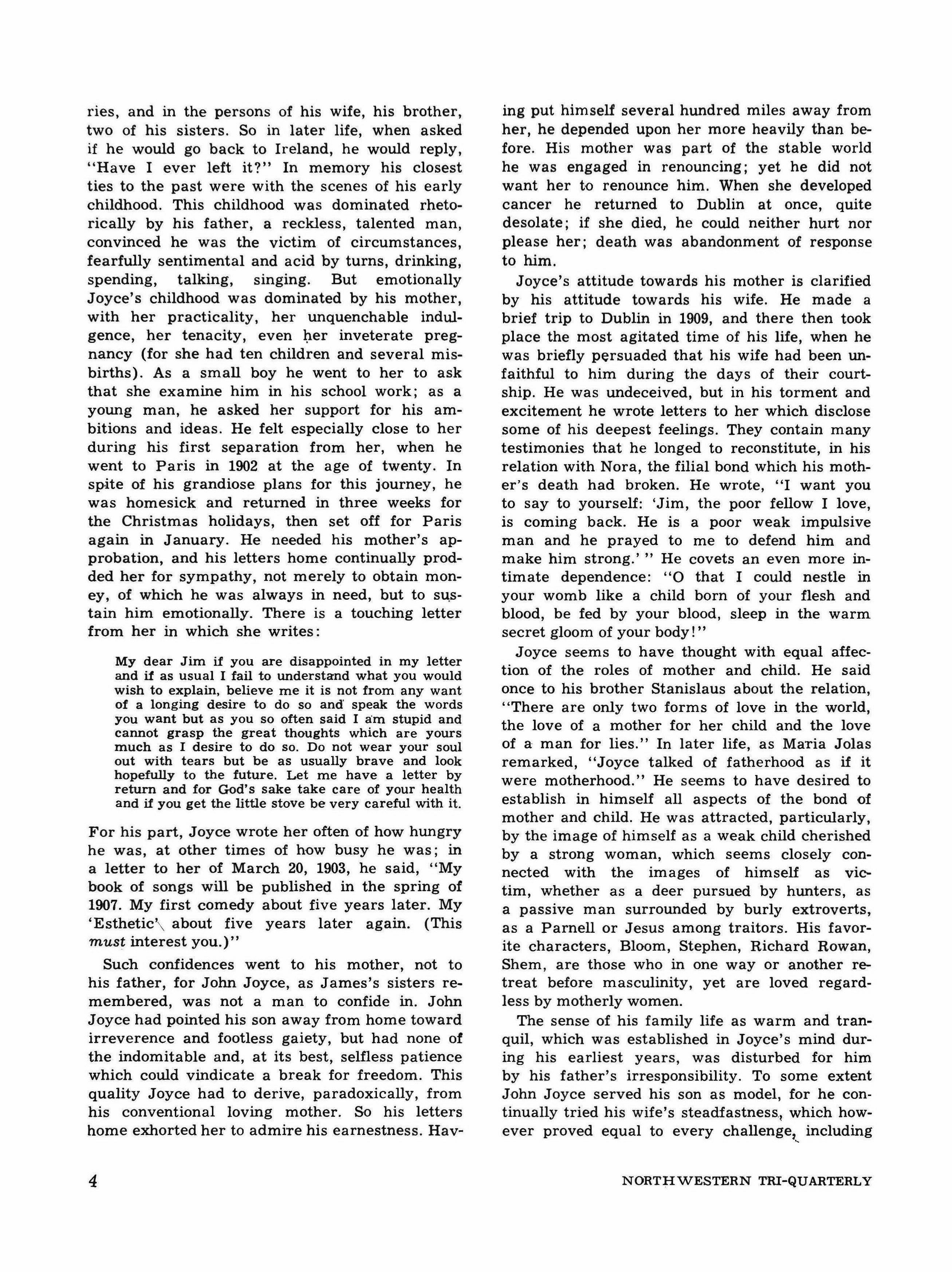 ries, and in the persons of his wife, his brother, two of his sisters. So in later life, when asked if he would go back to Ireland, he would reply, "Have I ever left it?" In memory his closest ties to the past were with the scenes of his early childhood. This childhood was dominated rhetorically by his father, a reckless, talented man, convinced he was the victim of circumstances, fearfully sentimental and acid by turns, drinking, spending, talking, singing. But emotionally Joyce's childhood was dominated by his mother, with her practicality, her unquenchable indulgence, her tenacity, even her inveterate pregnancy (for she had ten children and several misbirths). As a small boy he went to her to ask that she examine him in his school work; as a young man, he asked her support for his ambitions and ideas. He felt especially close to her during his first separation from her, when he went to Paris in 1902 at the age of twenty. In spite of his grandiose plans for this journey, he was homesick and returned in three weeks for the Christmas holidays, then set off for Paris again in January. He needed his mother's approbation, and his letters home continually prodded her for sympathy, not merely to obtain money, of which he was always in need, but to sustain him emotionally. There is a touching letter from her in which she writes: