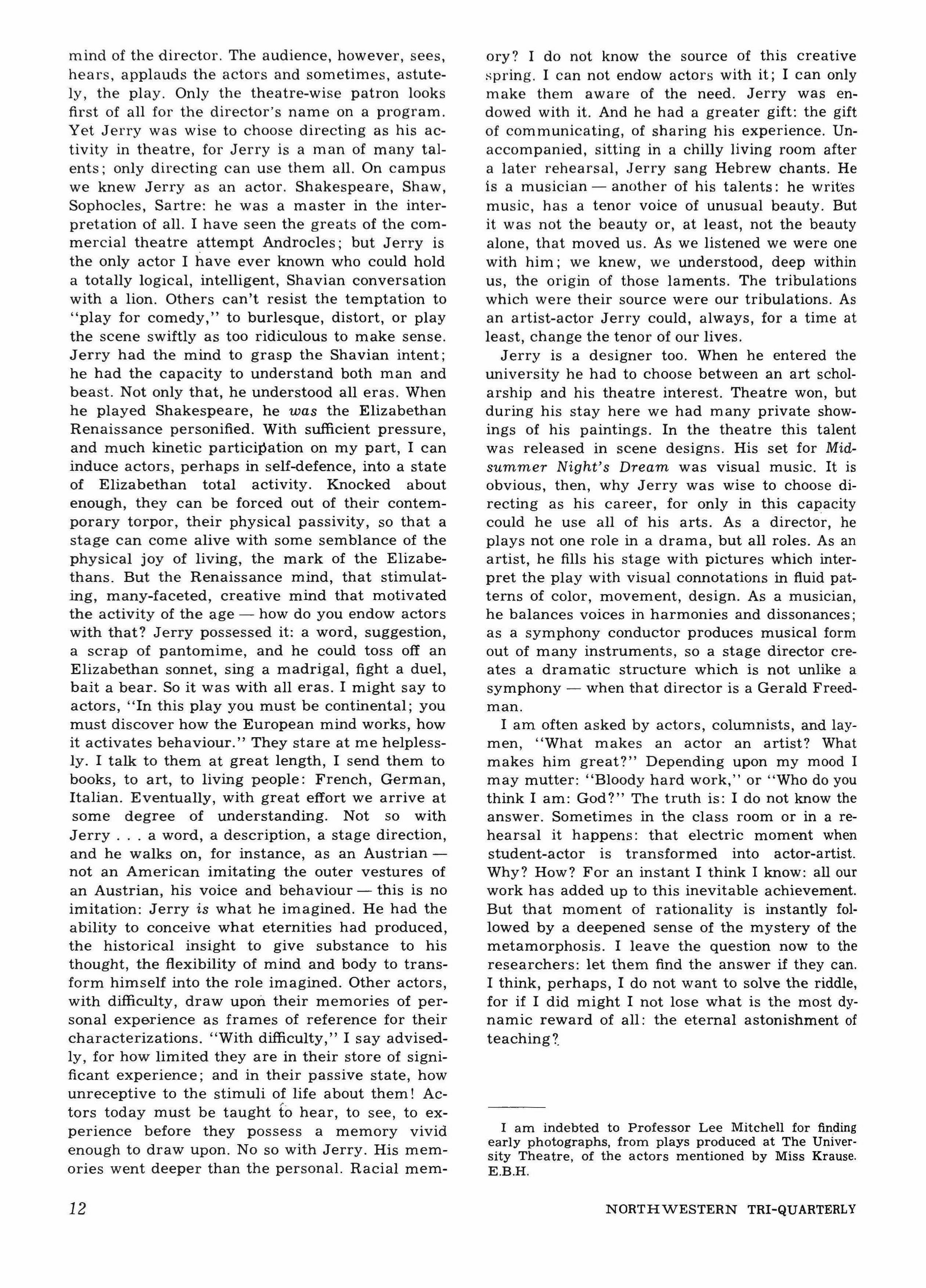 mind of the director. The audience, however, sees, hears, applauds the actors and sometimes, astutely, the play. Only the theatre-wise patron looks first of all for the director's name on a program. Yet Jerry was wise to choose directing as his activity in theatre, for Jerry is a man of many talents; only directing can use them all. On campus we knew Jerry as an actor. Shakespeare, Shaw, Sophocles, Sartre: he was a master in the interpretation of all. I have seen the greats of the commercial theatre attempt Androcles; but Jerry is the only actor I have ever known who could hold a totally logical, intelligent, Shavian conversation with a lion. Others can't resist the temptation to "play for comedy," to burlesque, distort, or play the scene swiftly as too ridiculous to make sense. Jerry had the mind to grasp the Shavian intent; he had the capacity to understand both man and beast. Not only that, he understood all eras. When he played Shakespeare, he was the Elizabethan Renaissance personified. With sufficient pressure, and much kinetic participation on my part, I can induce actors, perhaps in self-defence, into a state of Elizabethan total activity. Knocked about enough, they can be forced out of their contemporary torpor, their physical passivity, so that a stage can come alive with some semblance of the physical joy of living, the mark of the Elizabethans. But the Renaissance mind, that stimulating, many-faceted, creative mind that motivated the activity of the age - how do you endow actors with that? Jerry possessed it: a word, suggestion, a scrap of pantomime, and he could toss off an Elizabethan sonnet, sing a madrigal, fight a duel, bait a bear. So it was with all eras. I might say to actors, "In this play you must be continental; you must discover how the European mind works, how it activates behaviour." They stare at me helplessly. I talk to them at great length, I send them to books, to art, to living people: French, German, Italian. Eventually, with great effort we arrive at some degree of understanding. Not so with Jerry a word, a description, a stage direction, and he walks on, for instance, as an Austriannot an American imitating the outer vestures of an Austrian, his voice and behaviour - this is no imitation: Jerry is what he imagined. He had the ability to conceive what eternities had produced, the historical insight to give substance to his thought, the flexibility of mind and body to transform himself into the role imagined. Other actors, with difficulty, draw upon their memories of personal experience as frames of reference for their characterizations. "With difficulty," I say advisedly, for how limited they are in their store of significant experience; and in their passive state, how unreceptive to the stimuli of life about them! Actors today must be taught to hear, to see, to experience before they possess a memory vivid enough to draw upon. No so with Jerry. His memories went deeper than the personal. Racial mem-