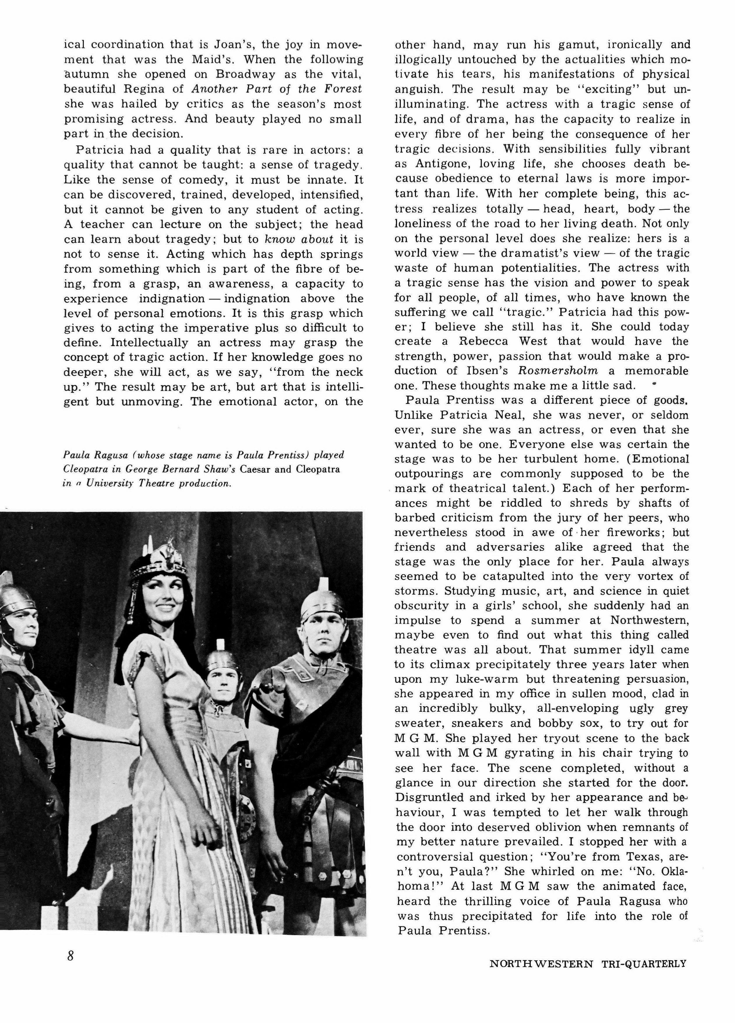 Paula Ragusa (whose stage name is Paula Prentiss) played Cleopatra in George Bernard Shaw's Caesar and Cleopatra in n University