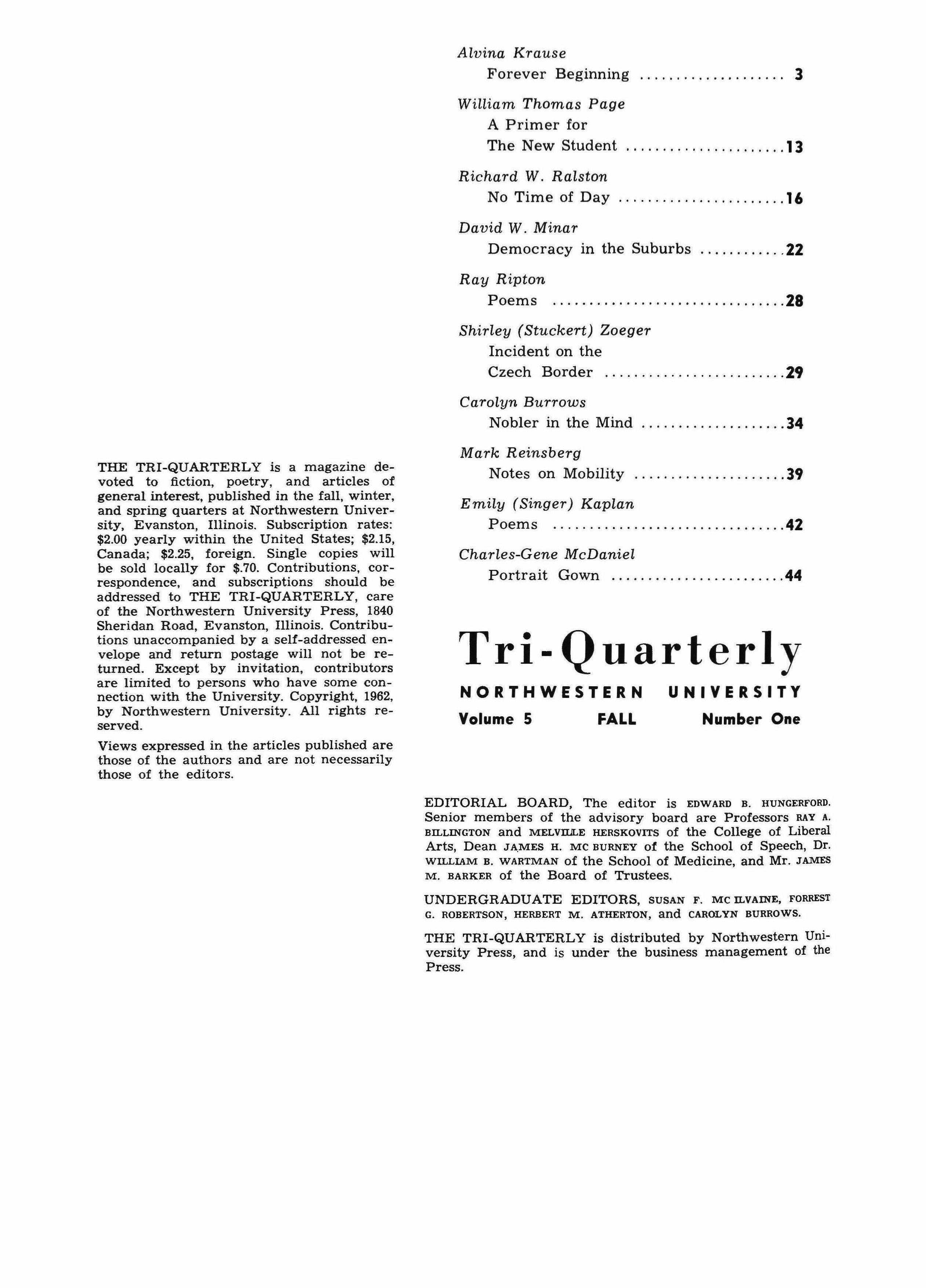 THE TRI-QUARTERLY is a magazine devoted to fiction, poetry, and articles of general interest, published in the fall, winter, and spring quarters at Northwestern University, Evanston, Illinois. Subscription rates: $2.00 yearly within the United States; $2.15, Canada; $2.25, foreign. Single copies will be sold locally for $.70. Contributions, correspondence, and subscriptions should be addressed to THE TRI-QUARTERLY, care of the Northwestern University Press, 1840 Sheridan Road, Evanston, Illinois. Contributions unaccompanied by a self-addressed envelope and return postage will not be returned. Except by invitation, contributors are limited to persons who have some connection with the University. Copyright, 1962, by Northwestern University. All rights reserved.