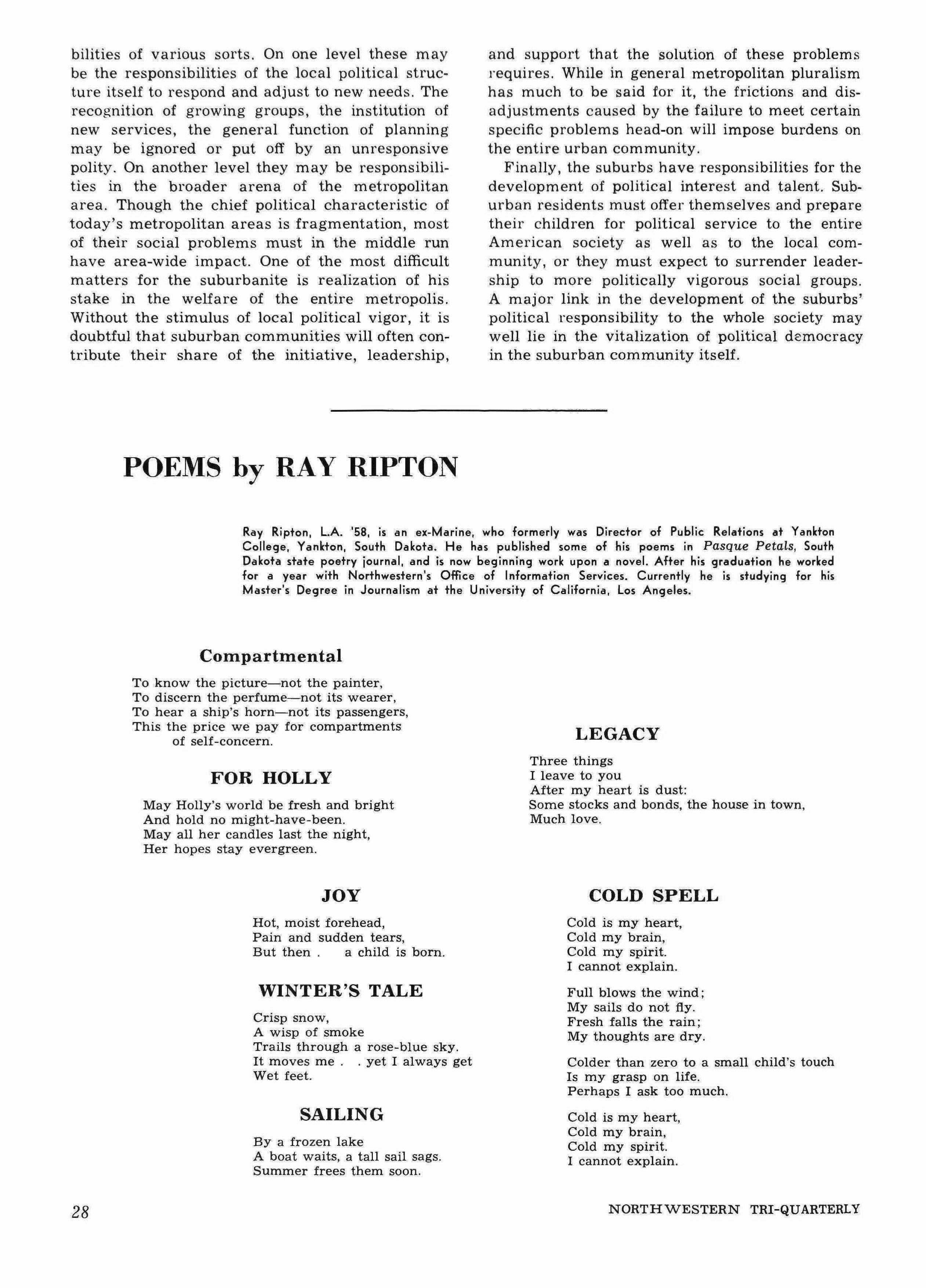 Alvina Krause Forever Beginning 3 William Thomas Page A Primer for The New Student 13 Richard W. Ralston No Time of Day 16 David W. Minar Democracy in the Suburbs 22 Ray Ripton Poems 28 Shirley (Stuckert) Zoeger Incident on the Czech Border 29 Carolyn Burrows Nobler in the Mind 34 Mark Reinsberg Notes on Mobility 39 Emily (Singer) Kaplan Poems 42 Charles-Gene McDaniel Portrait Gown 44 Tri-Quarterly NORTHWESTERN UNIVERSITY Volume 5 FALL Number One
