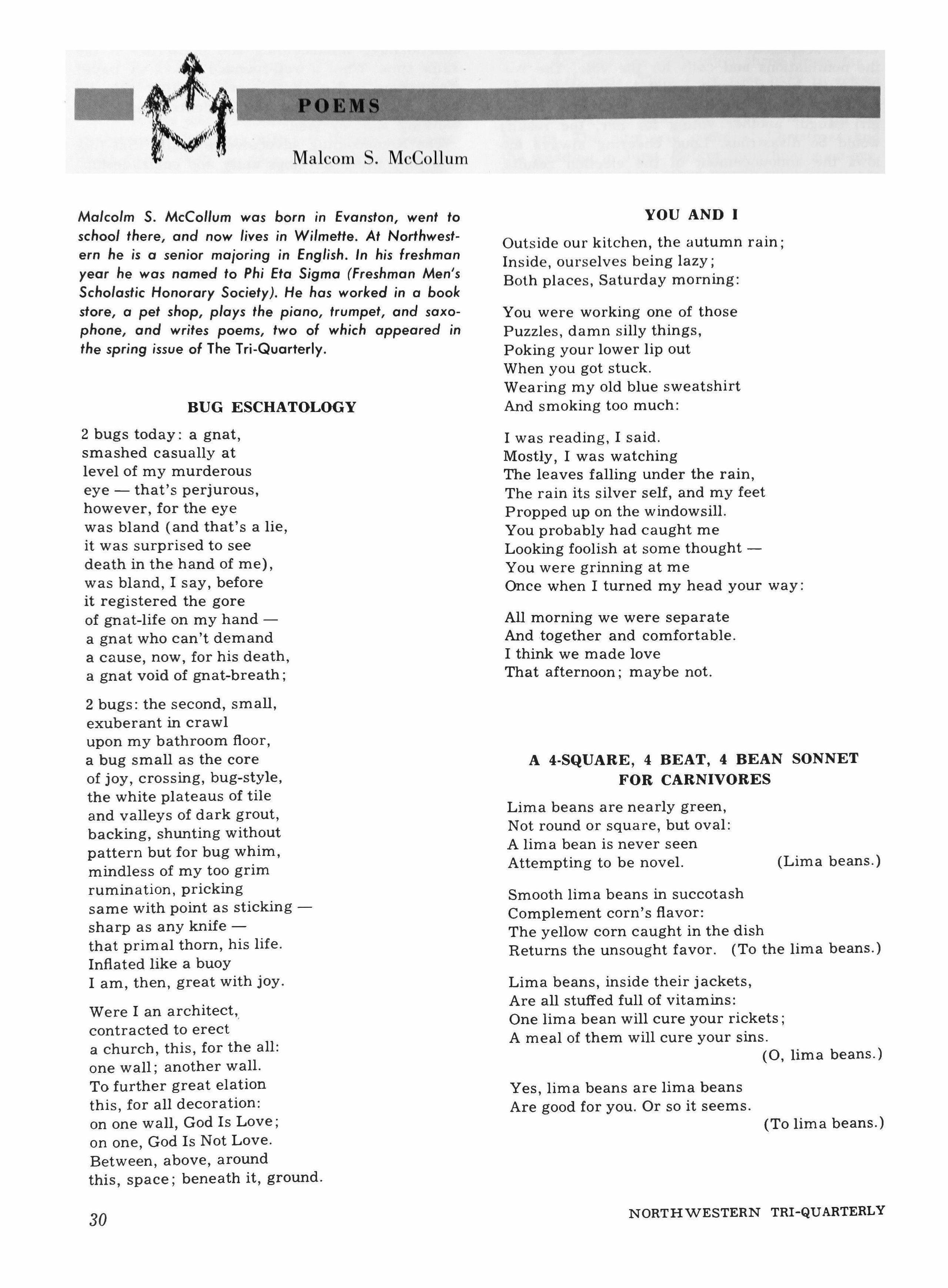 THE TRI-QUARTERLY is a magazine devoted to fiction, poetry, and articles of general interest, published in the fall, winter, and spring quarters at Northwestern University, Evanston, Illinois. Subcription rates: $2.00 yearly within the United States; $2.15, Canada; $2.25, foreign. Single copies will be sold locally for $.70. Contributions, correspondence, and subscriptions should be addressed to THE TRI-QUARTERLY, care of the Northwestern University Press, 1840 Sheridan Roael, Evanston, illinois. Contributions unaccompanied by a self-addressed envelope and return postage will not be returned. Except by invitation, contributors are limited to persons who have some connection with the University. Copyright, 1963, by Northwestern University. All rights reserved.