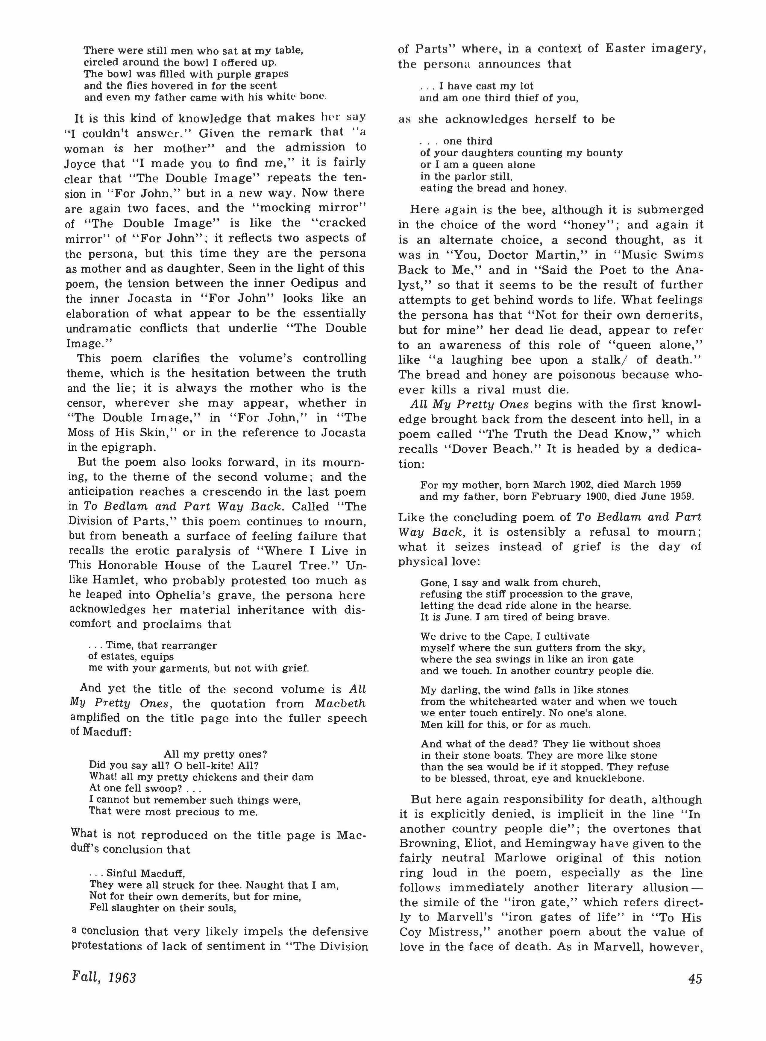 But the poem also looks forward, in its mourning, to the theme of the second volume; and the anticipation reaches a crescendo in the last poem in To Bedlam and Part Way Back. Called "The Division of Parts," this poem continues to mourn, but from beneath a surface of feeling failure that recalls the erotic paralysis of "Where I Live in This Honorable House of the Laurel Tree." Unlike Hamlet, who probably protested too much as he leaped into Ophelia's grave, the persona here acknowledges her material inheritance with discomfort and proclaims that Time, that rearranger of estates, equips me with your garments, but not with grief.