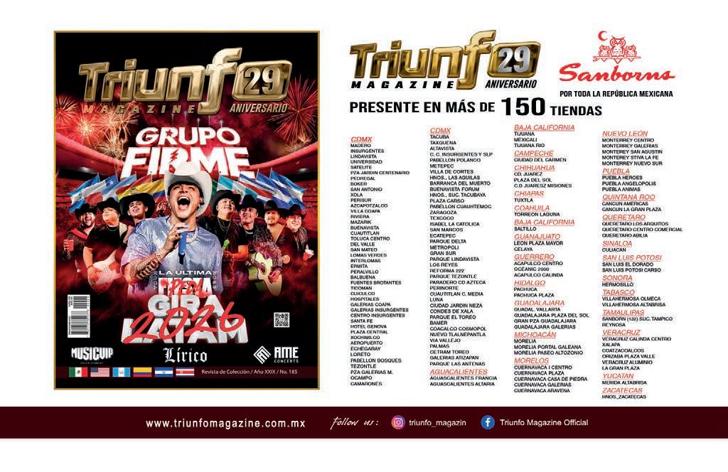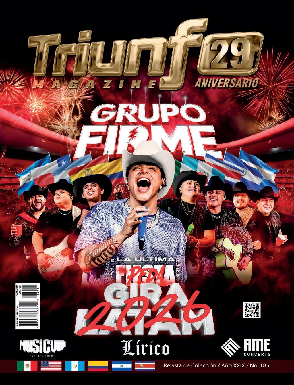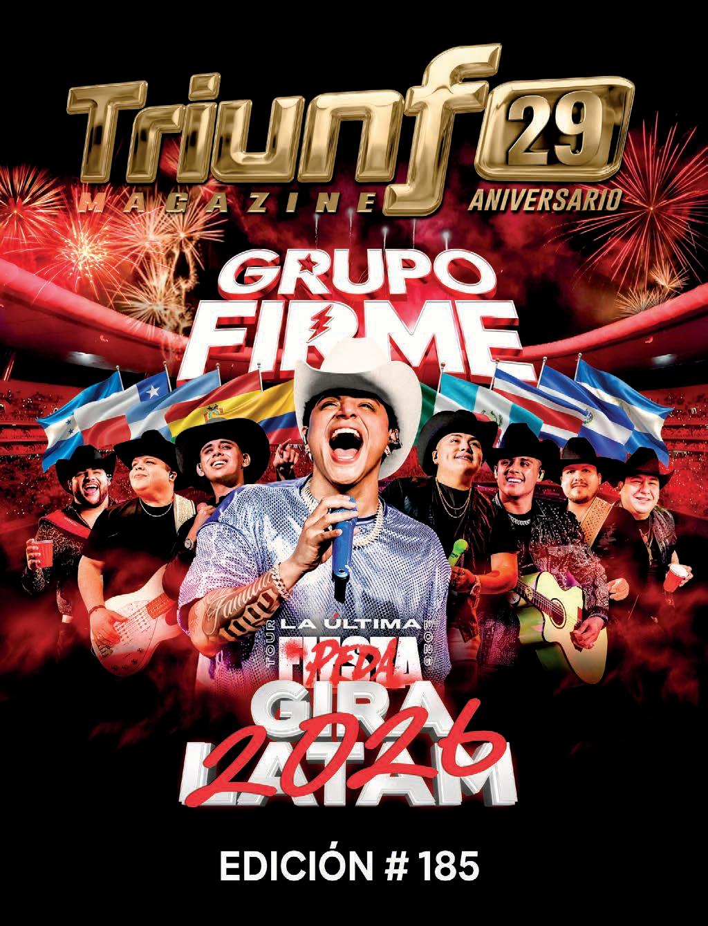 TRIUNFO MAGAZINE", la revista líder en México, Estados Unidos, Guatemala, Colombia, Honduras, El Salvador y Costa Rica, con 29 Años en el medio de la industria musical, presenta en su PORTADA DE LUJO DE LA EDICIÓN #185, a GRUPO FIRME con su GIRA LATAM 2026.