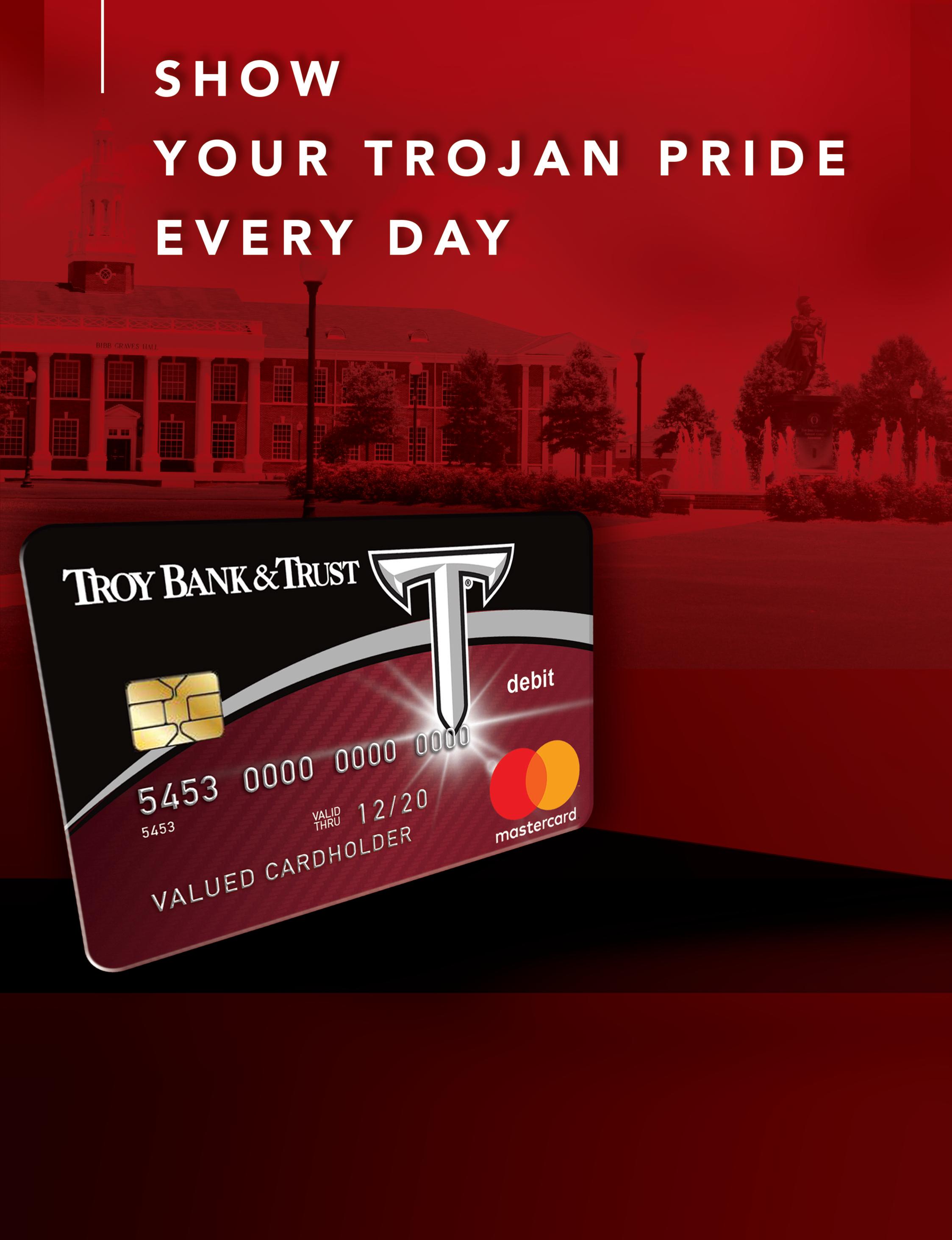 3 3 4 - 8 0 7 - 5 1 8 6 • w w w . t r o y b a n k a n d t r u s t . c o m N o w y o u c a n s h o w y o u r Tr o j a n S p i r i t e v e r y t i m e y o u m a k e a purchase. TB&T is thrilled to support Troy University by offering our customers yet another great reason to love your hometown bank. I n s t a n t I s s u e D e b i t C a r d s a v a i l a b l e a t t h e f o l l o w i n g b r a n c h e s : M a i n O f f i c e , S o u t h , E l b a , D o t h a n , o r A u b u r n Yo u m a y a l s o c o n t a c t o u r e B a n k i n g D e p a r t m e n t a t e b a n k i n g @ t r o y b a n k a n d t r u s t c o m * R e p l a c e m e n t c a r d f e e m a y a p p l y T R O J A N
