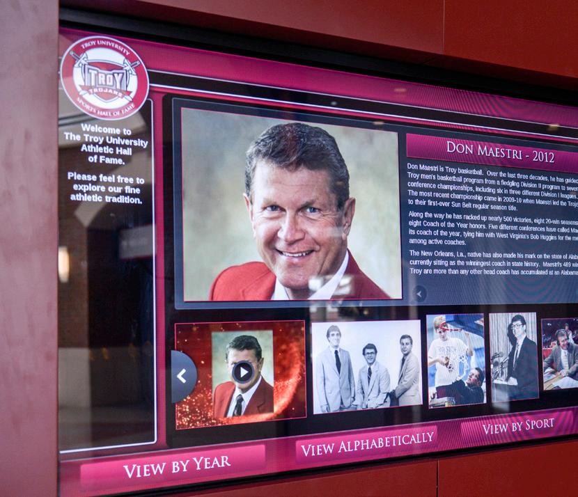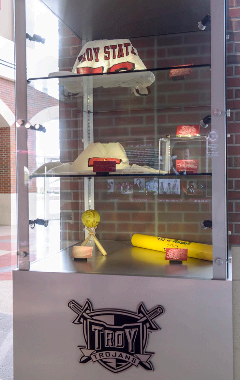 Between the two monitors is a wall displaying permanently the names of all members. The Hall of Fame area of Trojan Arena also features numerous artifacts from throughout the history of Troy University Athletics.