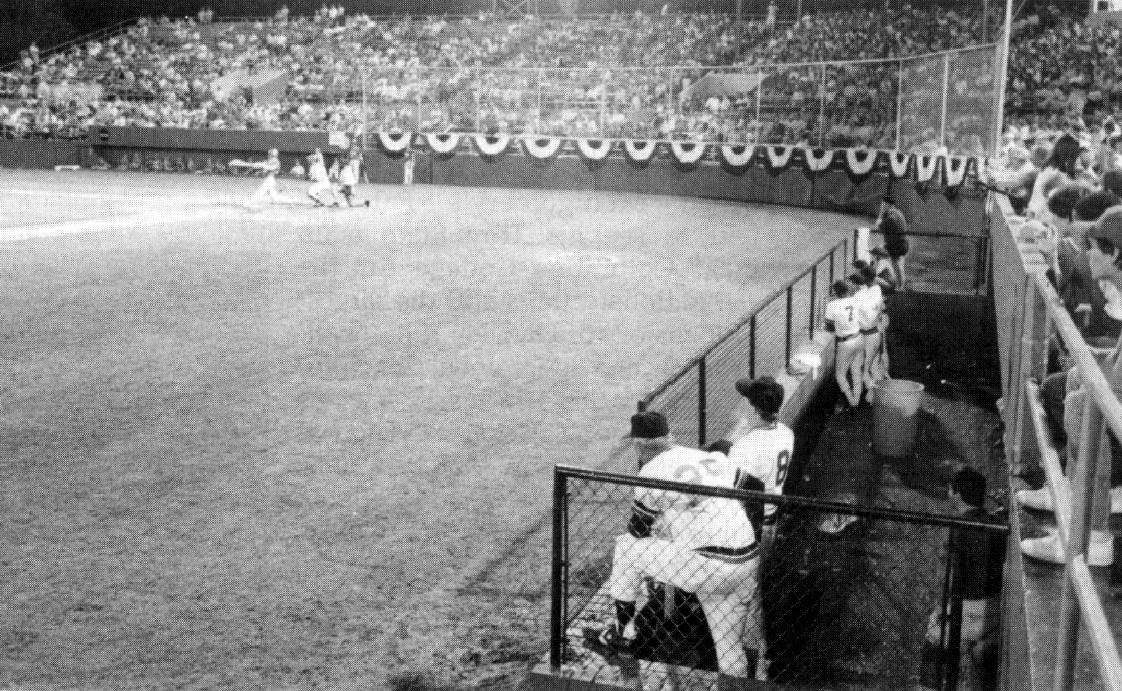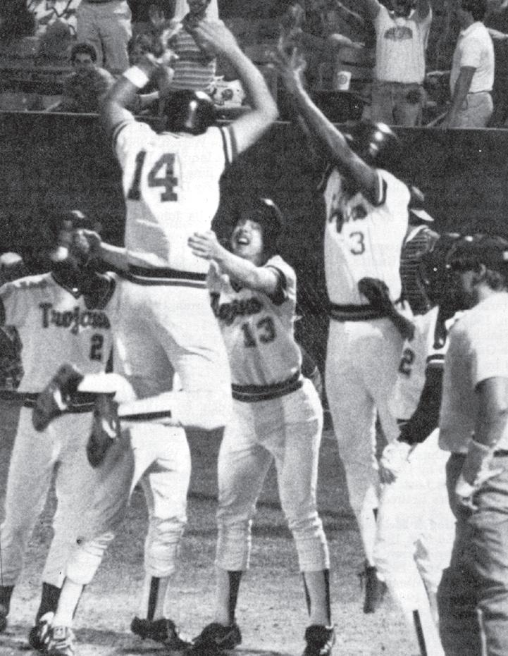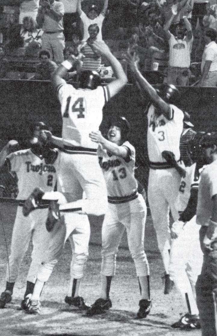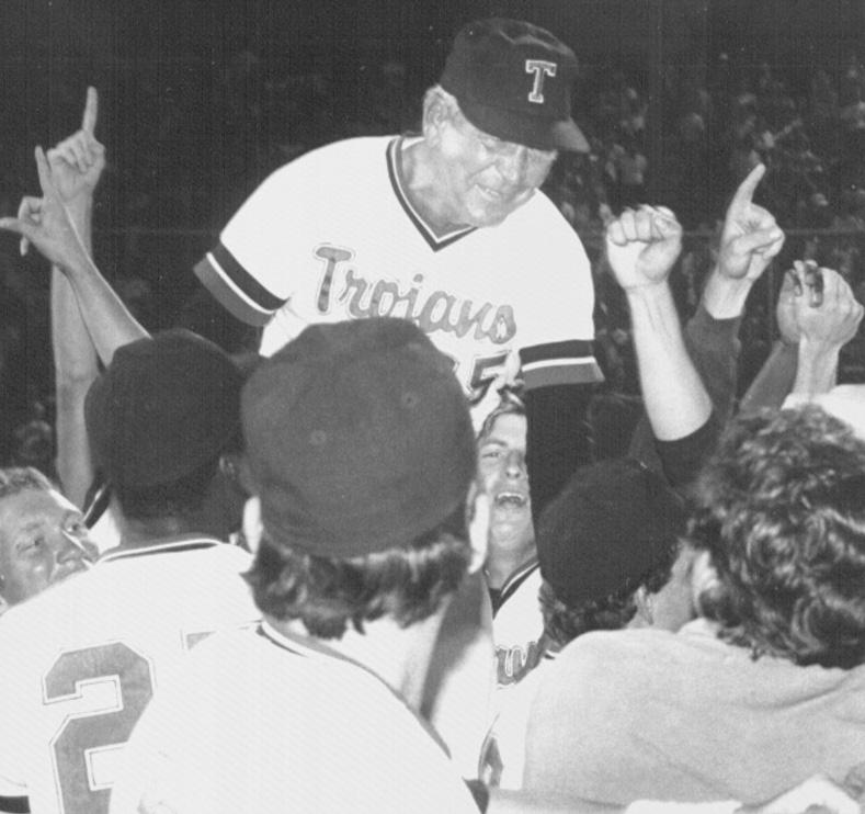 Above: Riddle watches the final inning of Mike Perez’s complete-game one-hitter over Columbus College in the 1986 NCAA Championship game.