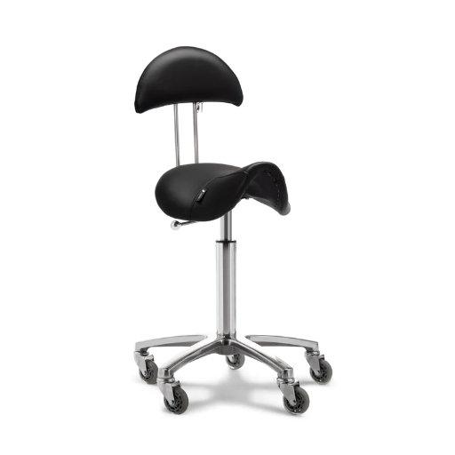 The Comfort stool is the evolution of the Saddle stool. By its backrest, it allows a support to the back making working from a seated position more comfortable. This stool also features anti-hair wheels