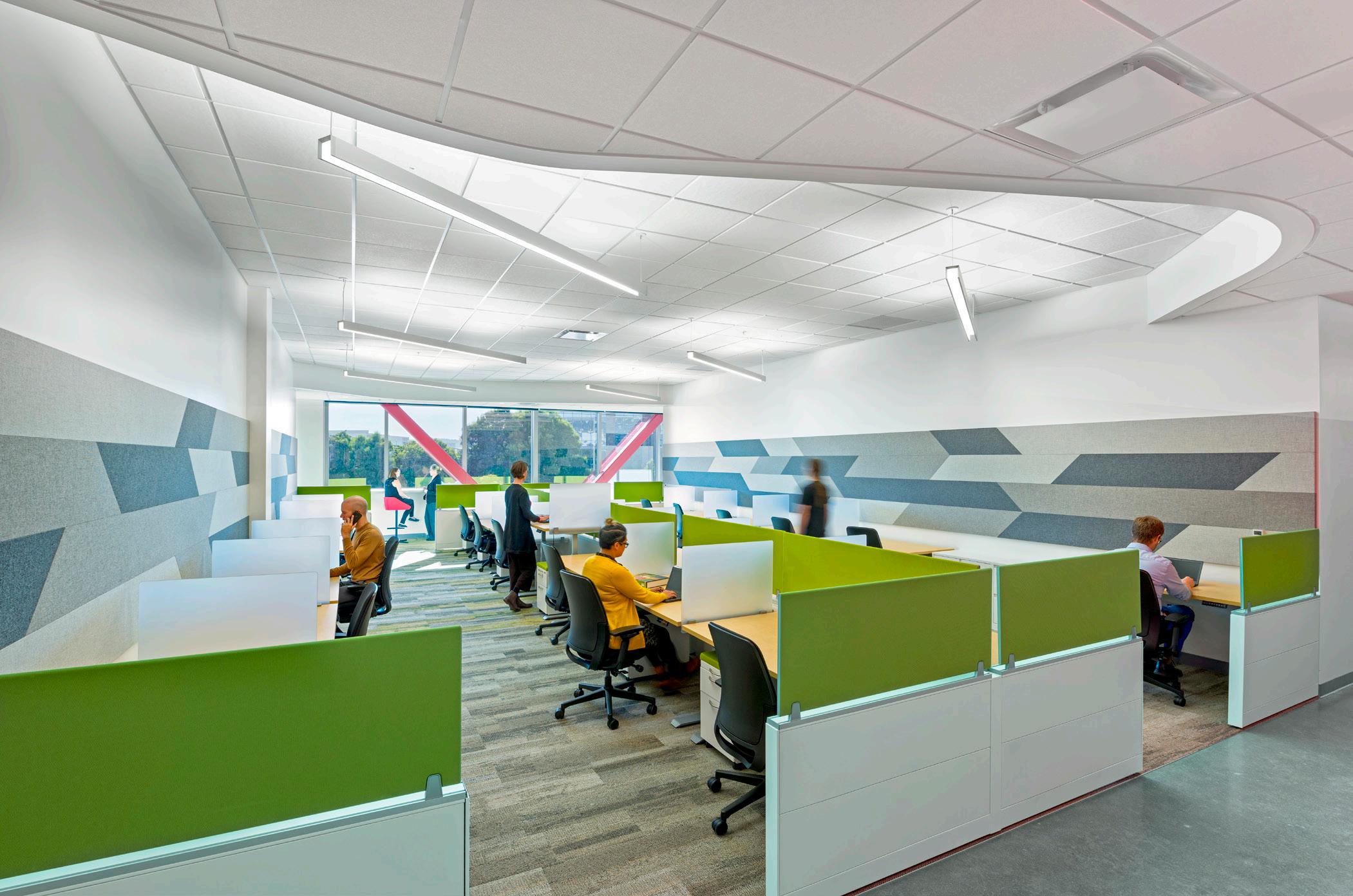 The state-of-the-art facility features an open-office floor plan, conference centers, executive suites, fitness center, full-service kitchen, cafeteria, and an employee break room complete with a 56-screen TV feature wall.