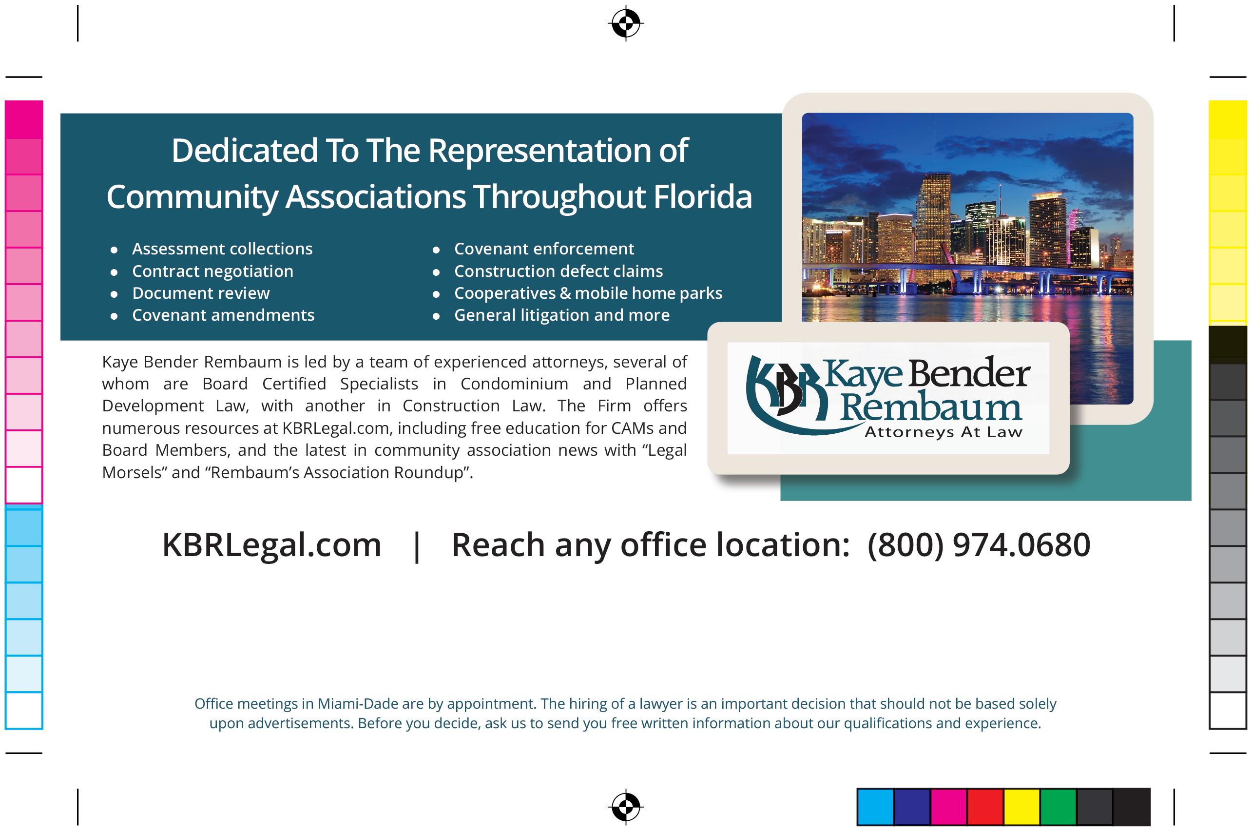 Turn to page 18 to read the Florida Law column by Michal J. Gelfand, Esq., with Gelfand & Arpe. He asks, “Which Came First: Flooding or Wind?” He is addressing the post-storm chaos and an association trying to identify whether wind, water, or both are specific causes of damage. It is a convoluted situation, and you will need to read to get the full details of the case and what was decided, but the following lessons shared by Gelfand should be learned: community associations need to understand their insurance policies and beware also of the danger of settling too quickly with one insurer when there may be additional damage to consider.