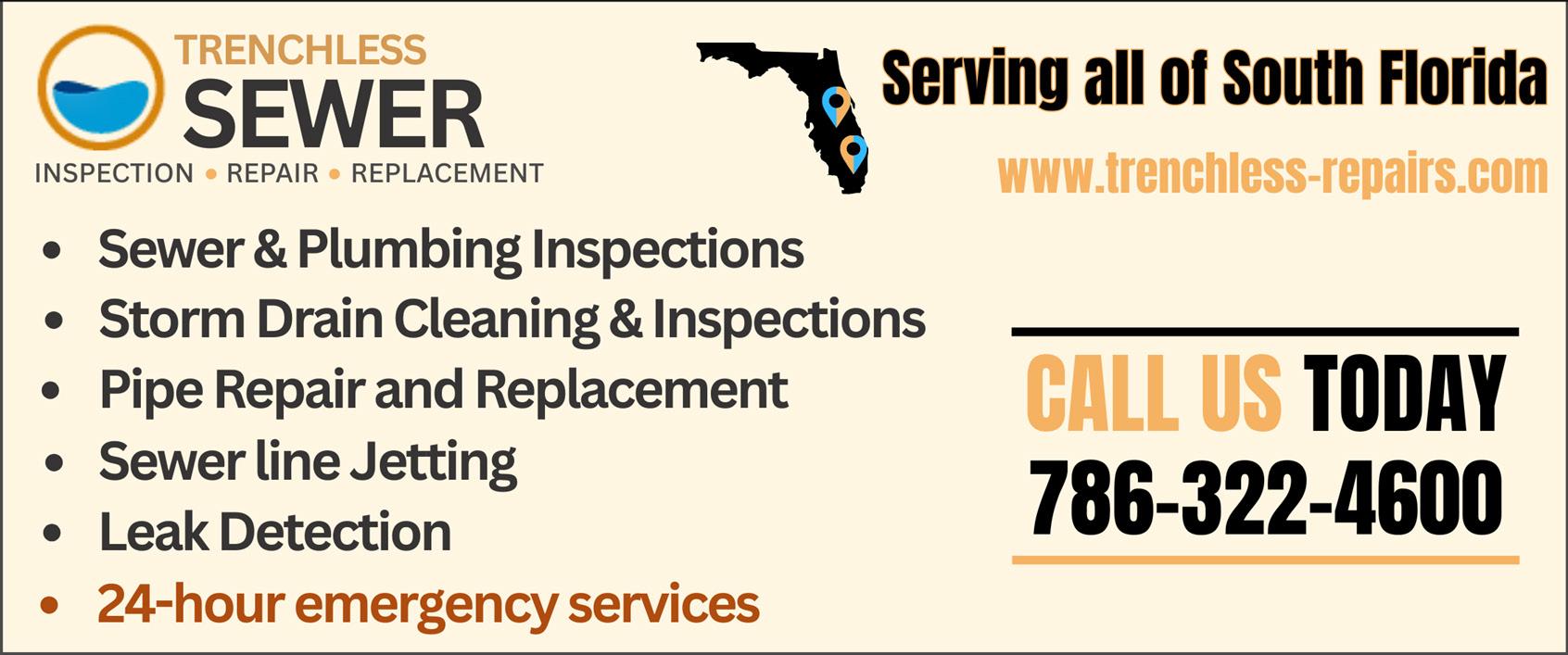 Trenchless Sewer Line Repairs: 786-322-4600; trench less-repairs.com
