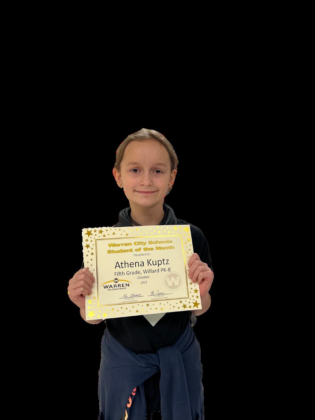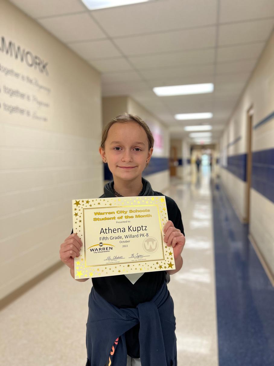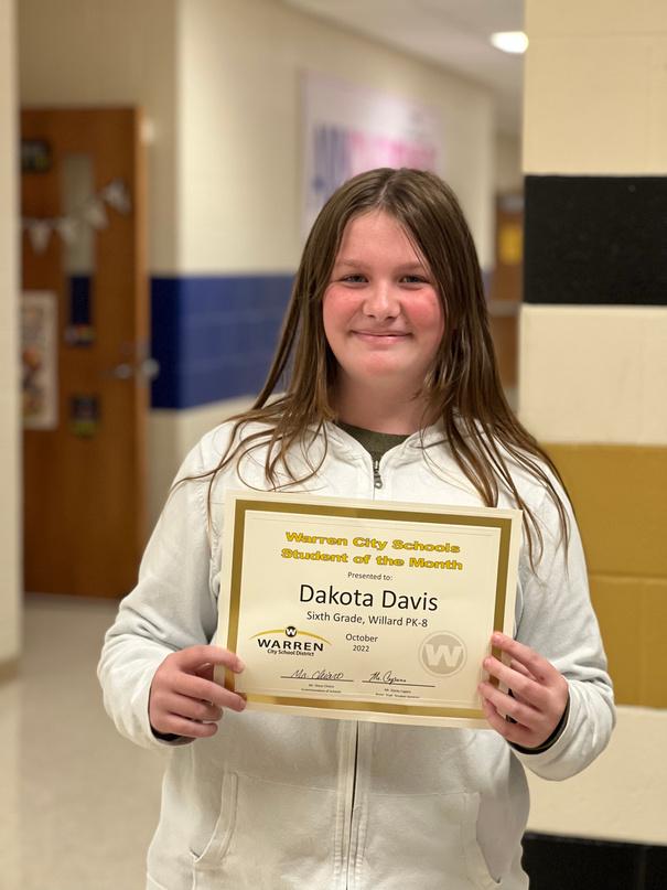 Willard 6 8 principal Mr. Rasile cites Dakota’s academic achievement, excellent attendance and respectful demeanor as reasons for her being selectedwiththismonth’saward.