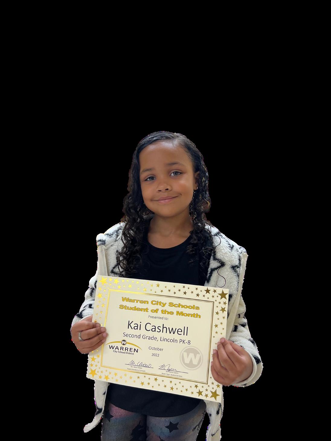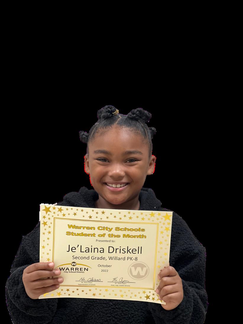 Kai Cashwell Kai thanks Ms. Gibson Williams for nominating her for Student of the Month. Kai’s favorite subject is moth and she enjoys drawing pictures of people. HerfavoriteteacherisMs.VanKirkbecausesheis“niceandpretty”. “Kai Cashwell was selected as our student of the month for consistently displaying fabulous WARREN attributes. She attempts all work with a stunning smile on her face. She is kind to her teacher and her classmates alike.Kaiisresponsible,rememberingherbelongingsatalltimes.And,Kaiis atalentedartistandagreatfriend.” LincolnPK 8TeacherMs.Gibson Williams 18 GRADE 2