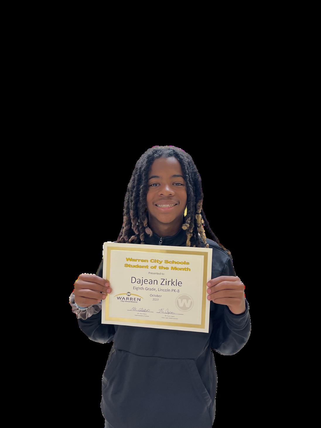 Zirkle "Dejean is continually on task, respectful of adults and peers, and always willing to help others. I have the pleasure of teaching Dajean 4 times a day andheisanabsolutejoythroughouttheday.” LincolnTeacherMs.Borsic When asked about his favorite subject, Dejean could not pick just one. However,hewasabletoeasilyidentifyMs.Borsicashisfavoriteteacherdue tohernicedemeanor,respectfulnatureandhighexpectations. HehasagoaltoearnallAsthroughoutthisschoolyear. Dejean enjoys playing tennis, and running track. Outside of school he like to playvideogames. 16 GRADE 8