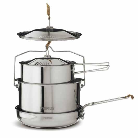 Large zijn te gebruiken op campingbranders en open vuur. Ze zijn eenvoudig af te gieten dankzij de deels geperforeerde deksels, en omdat de handgrepen weg te klappen zijn, is de hele set makkelijk in elkaar te stapelen. Ideaal toch? Van Primus.