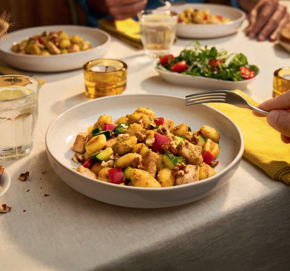 5 Voeg de gebakken gnocchi toe en meng goed door. Garneer met 30g geroosterde walnoten. En buon appetito!