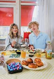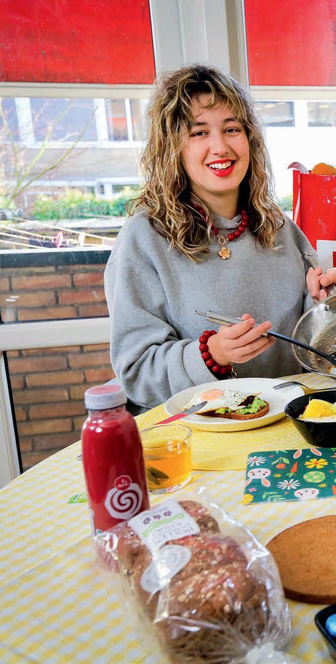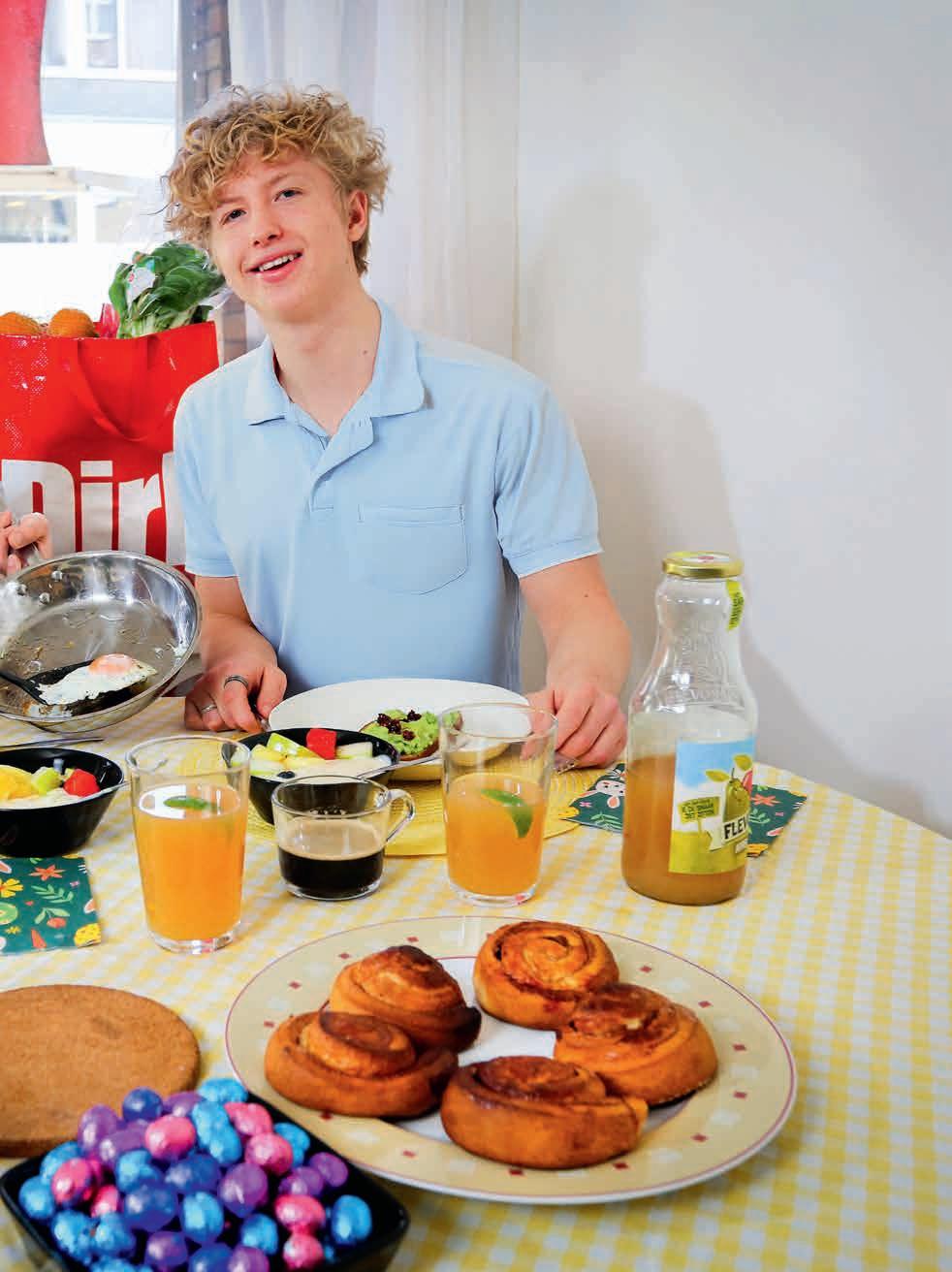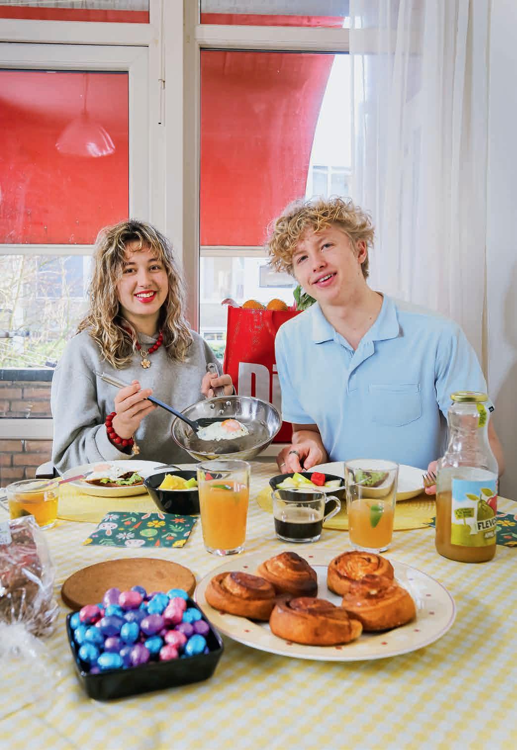 Bo (20) en Kai (20) leerden elkaar kennen bij de Leidse studentenvereniging SSR. Ze schuiven vandaag aan voor een lekker paasontbijt. ,,Eigenlijk ontbijten we altijd wel uitgebreid”, zegt Bo. ,,Maar dan wel vaak als ontbijt op bed”, vult Kai lachend aan. We zijn te gast in zijn studentenhuis. Bo woont nog thuis in Haarlem.