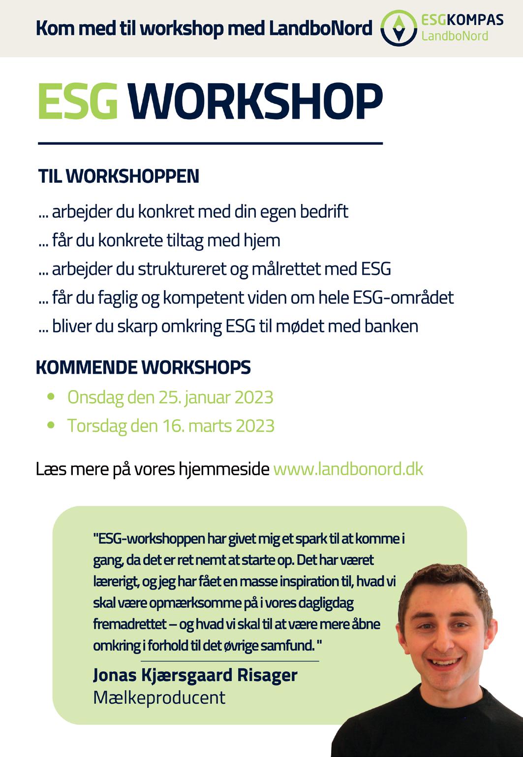 Bliv klogere på ESG til LandboNords ESG-workshop. Kommende datoer er onsdag d. 25. januar og torsdag d. 16. marts 2023. Se mere på www.LandboNord.dk