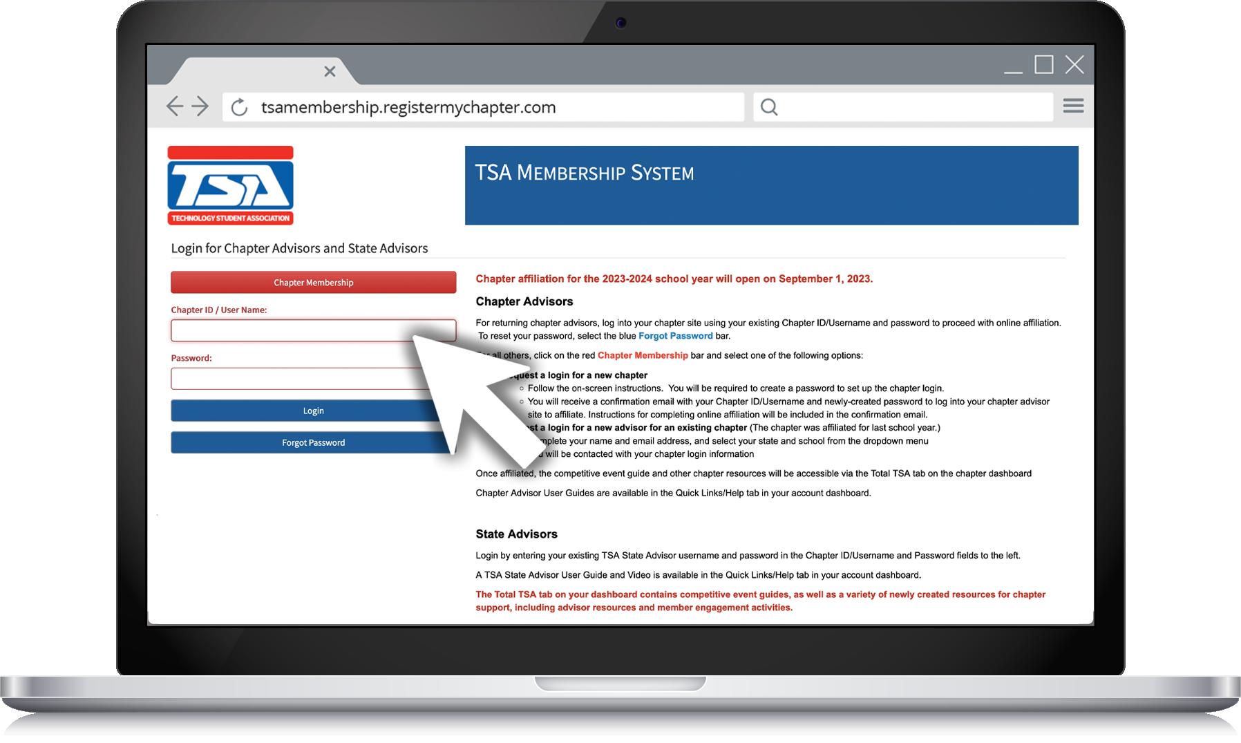 Returning TSA chapters: From the Advisor Login tab on the TSA website, previous-year chapter advisors may log in to their chapter site in the TSA Membership System using their existing chapter ID/username and password –and then proceed to online affiliation.