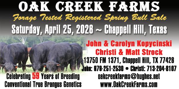 Oak Creek Farms: Forage Tested Registered Spring Bull Sale Where: Chappell Hill When: 12:30 p.m.