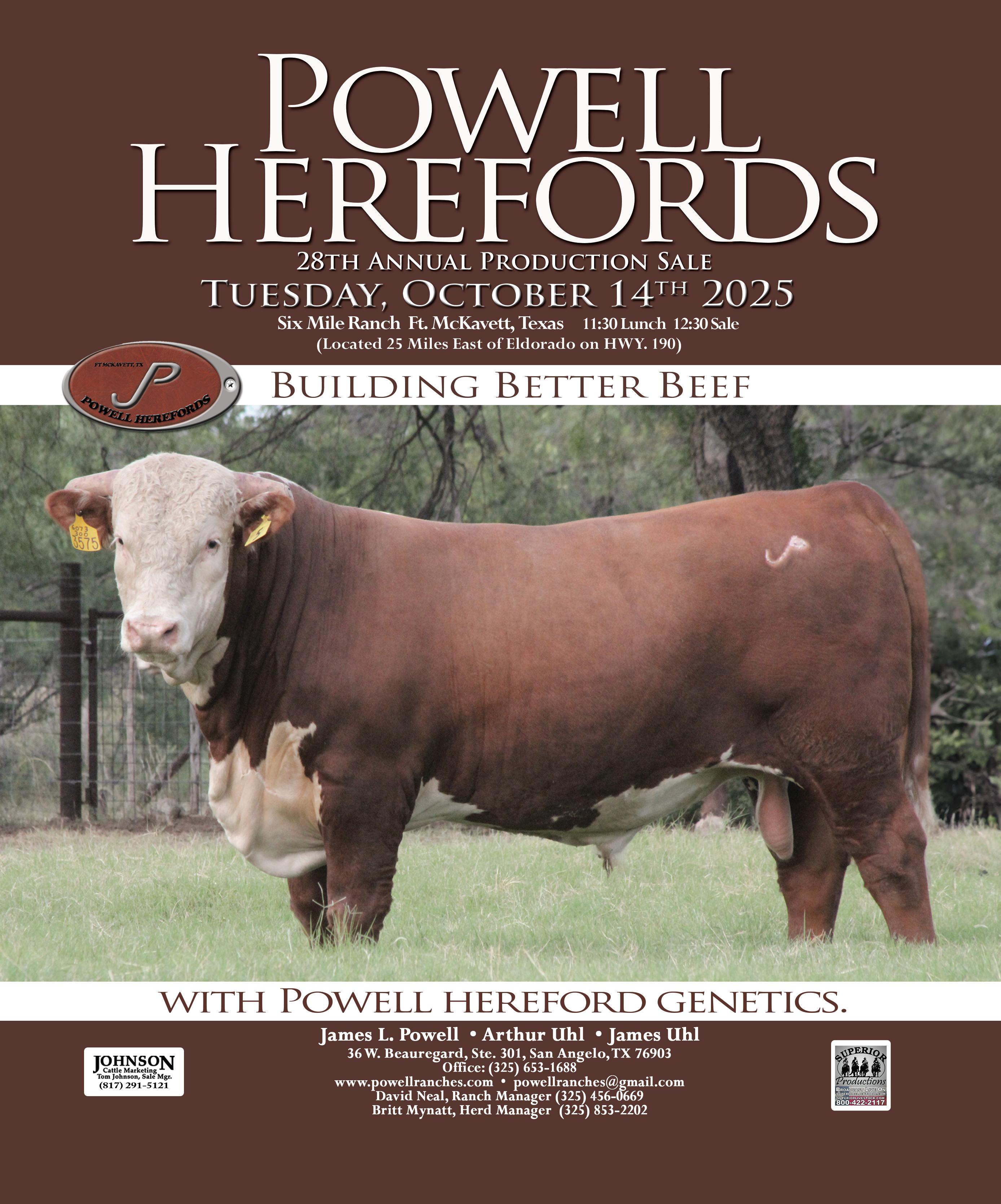 Powell Ranch Herefords: 28th Annual Production Sale Where: Fort McKavett When: 12:30 p.m.