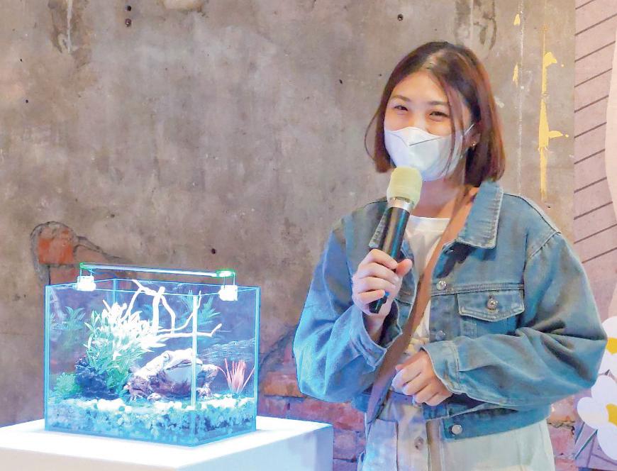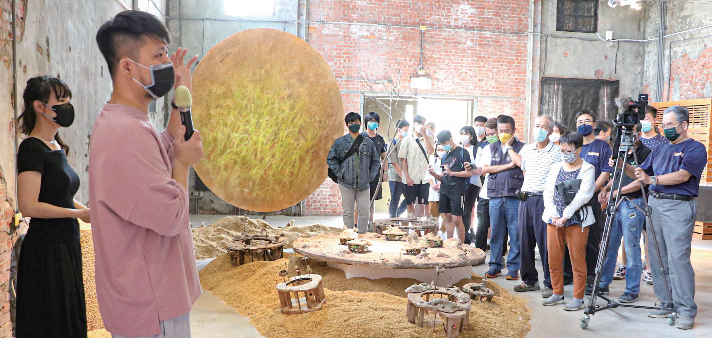 新港‧微笑的故鄉 20 蟾蜍被賦予「招財」的吉祥寓意著手 創作。 她從「演化」的角度思考生物的可 遺傳性狀在世代間複製及傳遞,而基 因突變可使性狀產生質變,造成個體 間的遺傳變異。因此,她以交趾陶創 造出謎樣生物,看似由青蛙變異,卻 像蟾蜍,令人摸不著頭緒。林怡君盼 從不同的表現手法和意義傳達,讓金 蟾蜍的形象產生特殊的違和感。她使 用了「陌生化」的藝術技巧,盼以這 種疏離效果,邀請觀眾理性判斷,進 而省思人造環境對自然的危害。 駱巧梅帶領新港藝術高中教師蔡梅 音、楊淑萍、黃心筠與學生,共創的 新媒體藝術裝置在本區呈現。新港藝 術高中透過跨領域STEAM藝術教學成 果,以虛擬元宇宙、動力裝置及光雕 投影,展現今昔新港風土及人文觀察。 本作意圖創造新的感官體驗,邀請 民眾沉浸新港的「未來想像」;透過 科技實驗,將元宇宙內的新港街景, 以實體再現而出,讓觀眾體驗日常生 活與歷史推演的進程與藝術的創意表 現。其中的動力藝術裝置,代表新港 歷史中的五分車。車子移動軌跡隱含 時間流動,與乘載居民的共同回憶。 林怡君〈金蟾蜍〉 駱巧梅(左一)與國立新港藝術高中師生〈STEAM藝術共創〉