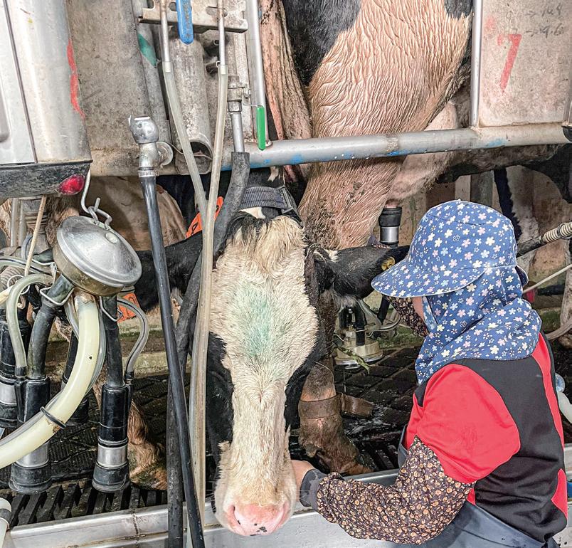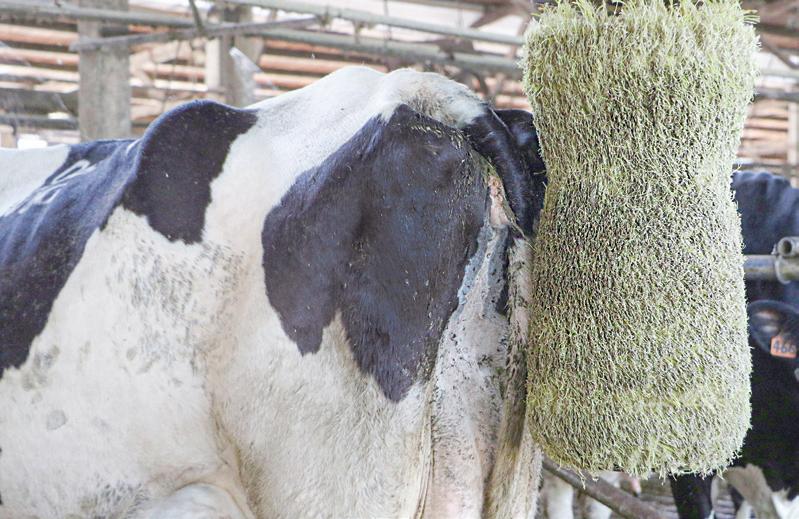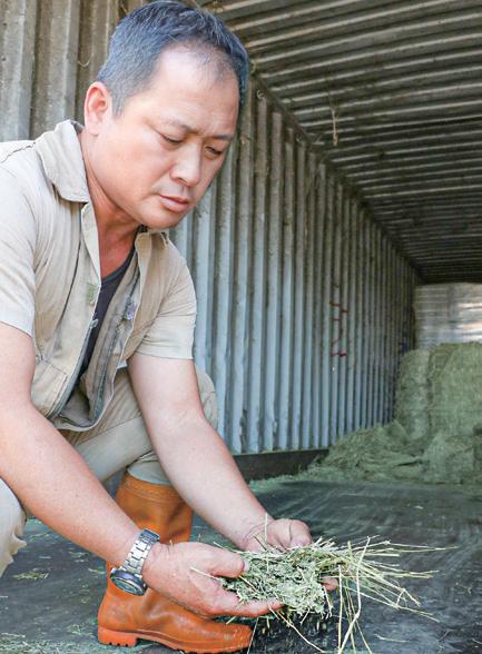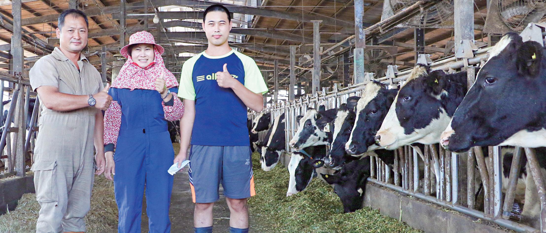 新港‧微笑的故鄉 8 間略長又無假期,因為乳牛產乳不等 人,但長期下來也培養他自己有「牛 格特質」溫馴地順應生活,凡事不強 碰。他說一天下來和牛相處的時間比 人還多,忙碌的生活裡,不管心情好 或不好,最紓壓的方式就是到牧場走 走,看看牛群,而且還會得到回應, 他笑笑地說:「牛比兒子乖啊!」 關於牧場裡禽畜糞處理,一般畜舍 透過處理設施篩分過濾到接近排水標 準,再排放出去,林老闆則是選擇回 歸土地,運用到自己栽種的牧草裡做 肥,自有土地及租賃共10公頃,收成 的牧草回到牛的嘴裡再產出好喝的鮮 乳,形成環境共生,友善的循環。 專業分工與經驗累積 產出高品質鮮奶 運用科技管理乳牛之前,每天早上 林憲明和妻子坐在一樓高的台椅,一 人一邊,整整40分鐘盯著一一走出的 乳牛,從步伐、姿態判斷乳牛是否進 入發情期或是身體不舒服。後來引進 科技管理,為乳牛戴上電子腳環,每 日透過電腦數據顯示,了解乳牛的狀 態,再由人工「親眼」判斷來交叉確 認,有時經驗豐富的員工運用「人眼」 會比機器提早發現問題呢! 林憲明(左一)全家一起與牛共「舞」,打造高品質鮮奶。 剛出生的小牛 每天供應新鮮多樣的牧草給乳牛享用