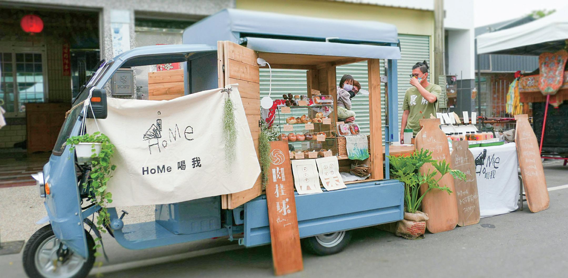 新港‧微笑的故鄉 8 回家做自己喜歡的味道 藉著智華在飲料店工作的經驗,理 所當然成為了HoMe何覓的「飲料部 門」,飲品包括碧婷愛喝的鮮奶茶系 列外,貼心的夫妻倆因為有些來逛市 集的小朋友不喝茶類,選擇利用新港 菜公村的茂谷柑及葡萄柚製作果汁, 透過簡潔的瓶身可以看到真材實料的 果粒,讓在地食材被看到,也讓大家 喝得安心。 在我們採訪的過程中,主掌「烘焙 部門」的碧婷正在烤麵包,當麵包從 烤模倒出的剎那,大家一陣驚呼,因 為倒出來的模型樣子正是一個「家」 的形狀,她說這是最近在研發的新產 品——料理麵包,未來會陸續尋找在地 食材,搭配象徵home品牌形象的麵包, 在麵包上層層堆疊出屬於家鄉的味道。 也許是因為學設計出身,在擺盤上的 美感也很講究,雖然還在開發中,但 對於那份與家鄉共好的心意,讓這道 料理增添了一份家鄉的味道。 在正職之餘,回到新港開始HoMe何 覓品牌也有六年了,目前以參與新港 文教基金會、女兒節、草草等在地市 集為主,也有人一喝成主顧,私訊粉 專希望訂購飲品到私人聚會,也偶爾 會打開淺藍色的餐車就在自家外面販 賣,詳細的出攤資訊都會公佈在臉書 粉專。 「HoMe何覓˙喝我」幸福的味道