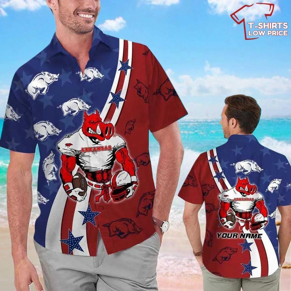 Arkansas Razorbacks American Flag Custom Name Hawa iian Shirt Outfit Buy Now