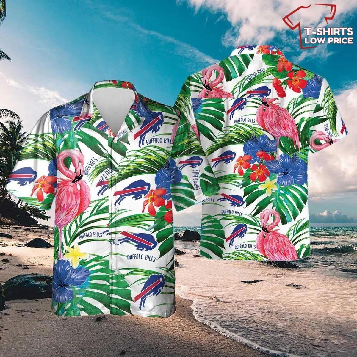 This shirt features a vibrant pattern that combines the iconic Buffalo Bills logo with flamingos and tropical elements. The blend of team spirit and beach-inspired motifs makes it a fun and playful addition to any outfit. Whether you're wearing it to a game, a summer party, or just out and about, this shirt is sure to turn heads and start conversations.