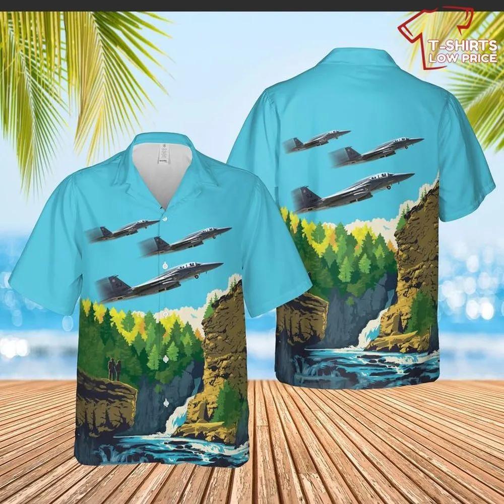 The shirt features a bold and colorful pattern inspired by the F-15E Strike Eagle aircraft, which is renowned for its superior performance and versatility in air combat missions. The design showcases the squadron's emblem as well as the iconic aircraft in action, soaring through the skies and leaving a trail of excitement and awe in its wake. Made from high-quality materials, this shirt is not only visually appealing but also extremely comfortable to wear. The button-up style allows for easy wearing and removal, making it suitable for casual outings, parties, or even as a casual uniform for those in the aviation industry. The breathable fabric ensures that the wearer stays cool, even in hot and humid weather conditions. May Be You Like: