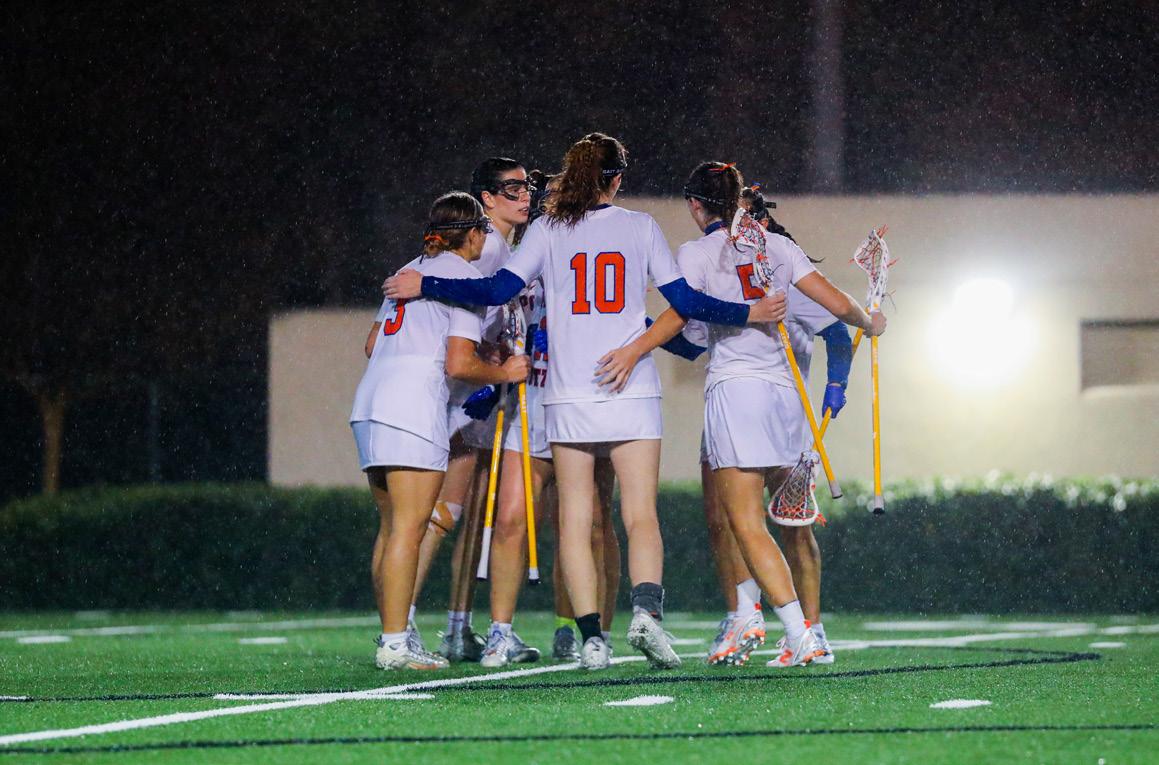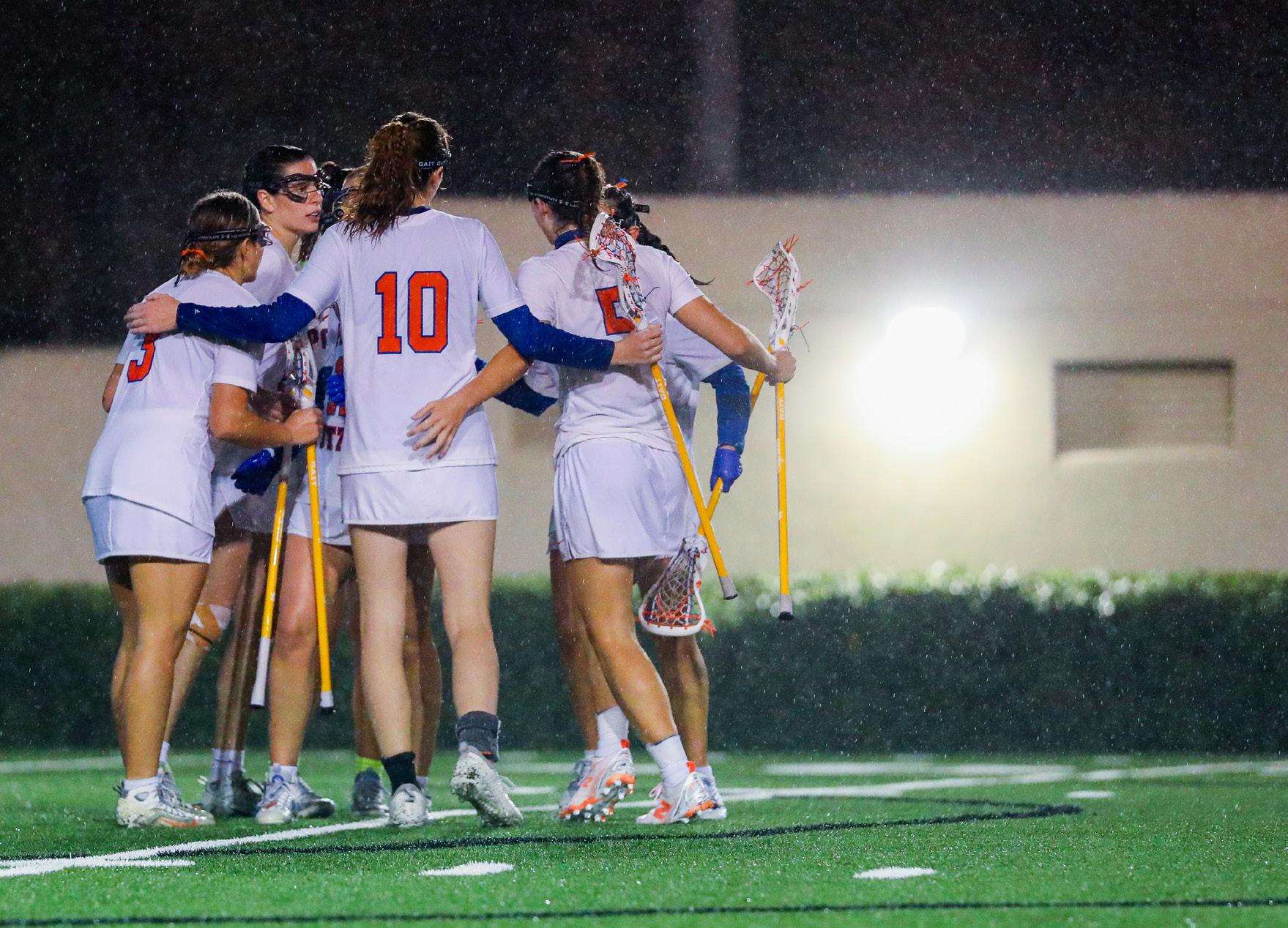 Pomona-Pitzer (P-P) lacrosse huddles during their rainy 12-11 victory over claremont-Mudd-Scripps (cMS)—their