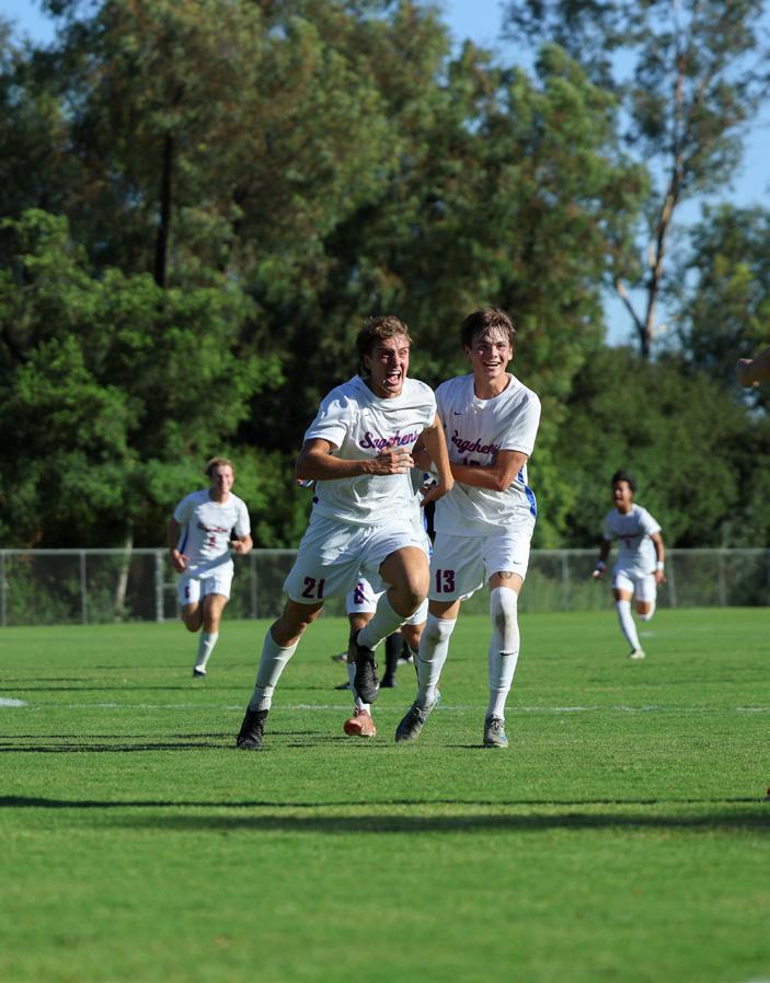The frst 30 minutes of the half resulted in a stalemate as the teams exchanged possession back and forth in midfeld. However, a cross from Alex Greenstein PZ ’26 set up Colin Eugster PO ’26 to break the deadlock and give the Sagehens the initial lead around the 33rd minute.