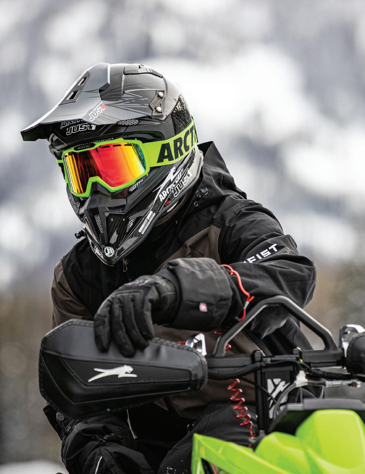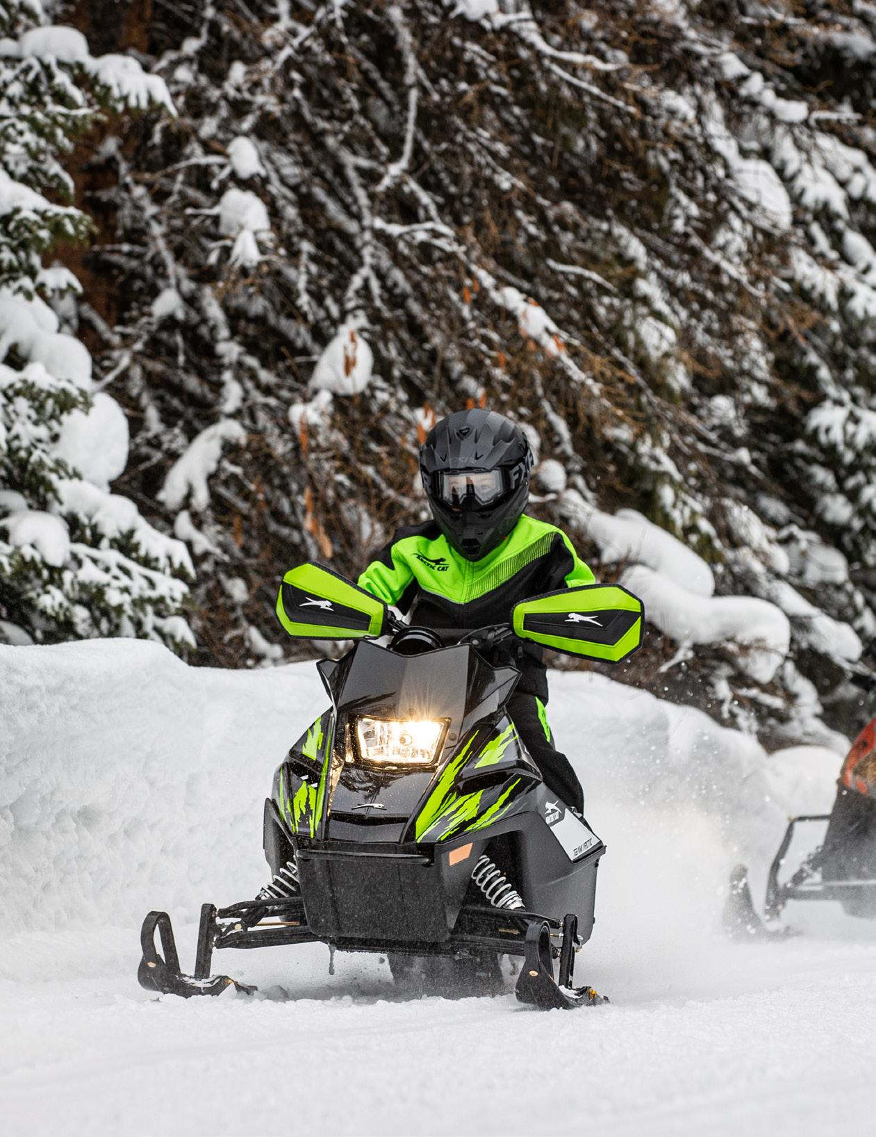 Snowmobiling is serious fun. Be sure to read and understand your owner’s manual and please pay special attention to the safety instructions. Arctic Cat Inc. endorses and encourages the safe use of all snowmobiles. Be careful, you can get hurt. Wear a helmet and don’t drink and ride. Be aware of natural hazards you may encounter, allow yourself plenty of room to safely stop your snowmobile under all conditions, and maintain your equipment. Your safety is in your hands, so take care. All scenes depicted or described in this brochure were performed by professional riders under carefully controlled conditions. Leave the fancy riding to the pros; they practice for years and train very hard to make it look easy. Never attempt to duplicate these maneuvers or encourage others to do so. We care about your safety and enjoyment of the sport.