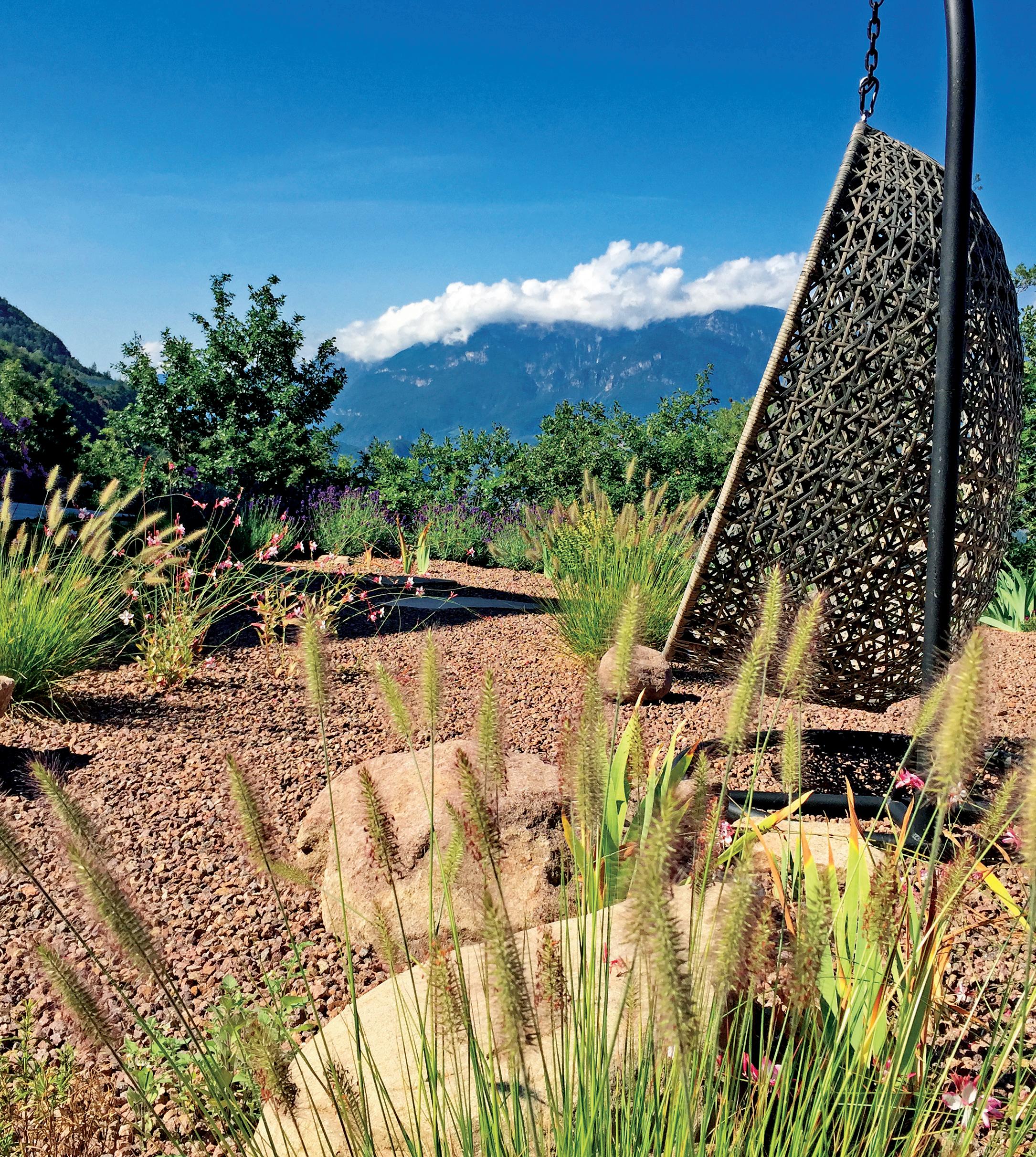Ein weiterer Blickfang ist der neue Wellnessgarten mit Bio-Naturbadeteich, der direkt vom über 3000m2 großen Indoor-Spabereich aus zugänglich ist. In den ersten Jahren war der Garberhof ein einfaches Hotel mit einer kleinen Saunalandschaft. Seit 2003 wurde der Wellnessbereich kontinuierlich erweitert, unter anderem durch den Bau des größten Hotel-Hamam Italiens. Mit dem Umbau 2022 setzte man das Augenmerk auf die Beauty- und Massageräume, die in Holzbauweise erneuert wurden. Auch ein zusätzlicher Ruheraum entstand. Im gesamten Wellnessbereich legte man Wert auf die Verwendung von nachhaltigen und natürlichen Materialien: Lehmputz und regionales Holz an den Wänden sowie Holzpfähle kontrastieren mit eleganten schwarzen Stahlelementen und schaffen ein einzigartiges Ambiente.