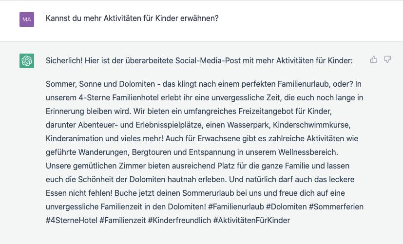schablonen bestehen, sehr monoton klingen, nicht gezielt auf Extrawünsche eingehen und im schlimmsten Fall dazu führen, dass der Gast sich nicht abgeholt fühlt, mit Frustration anstatt mit Freude reagiert und sich letztendlich für einen anderen Urlaubsort entscheidet. Ein weiterer Schwachpunkt von ChatGPT ist, dass es noch eine sehr einfache Struktur mit vielen Wortwiederholungen verwendet, die stilistisch nicht besonders ansprechend ist. In einer Branche, wo die unterschiedlichen Betriebe auch ihr eigenes Wording benutzen, stellt das eine Herausforderung und ein großes Manko dar. ChatGPT kann somit neue, kreative Anreize schaffen, eine Überarbeitung von Menschenhand ist aber