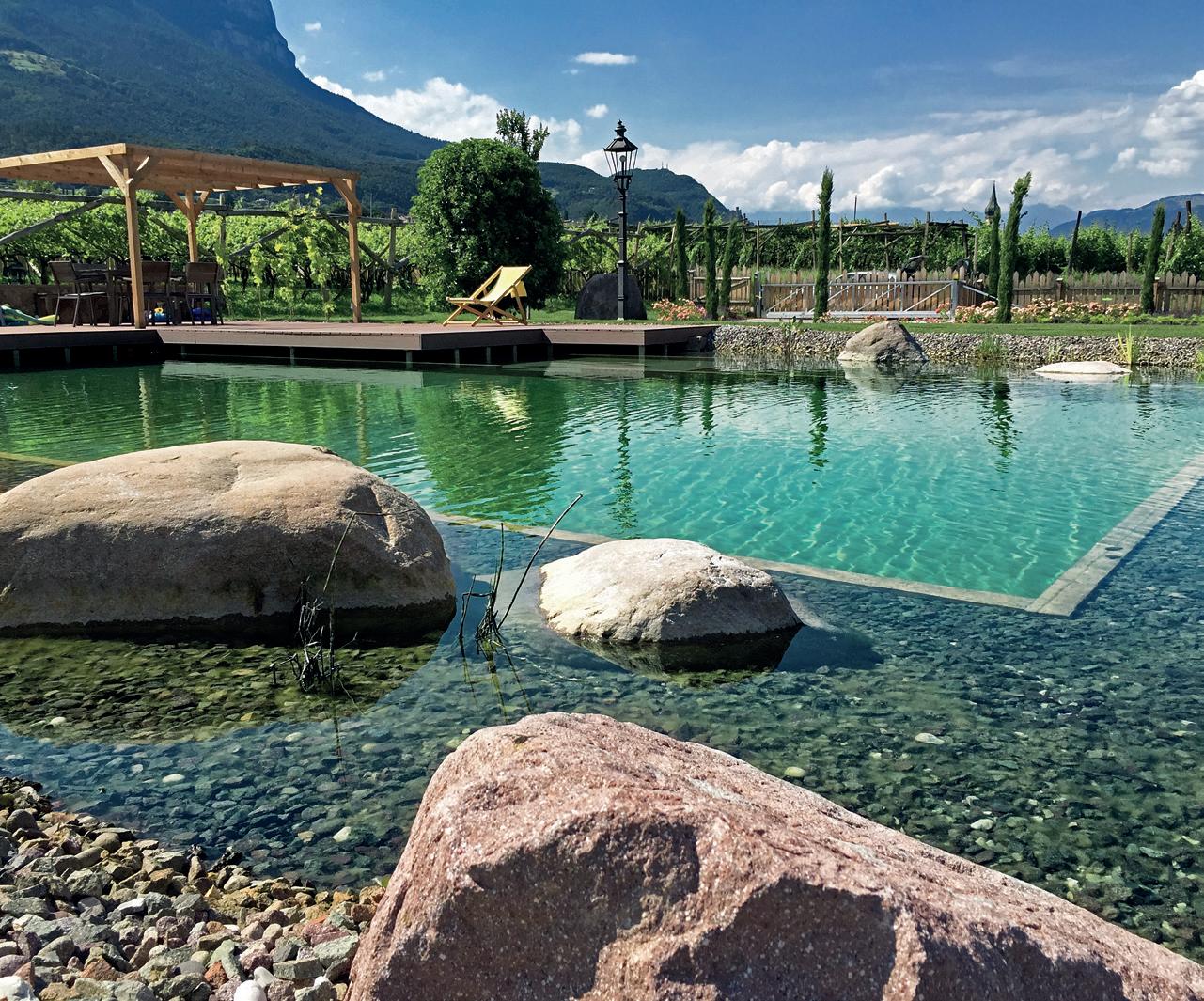 Der neue Bioteich mit einem Schwimmbereich von 140 m2 und einer Wassertiefe von 125 cm überzeugt mit seinem individuellen Design und fügt sich harmonisch in den Wellnessgarten des Garberhof ein. Der Boden des Schwimmbereiches wurde mit BioFlagstone-Großformat-Fliesen in Porphyroptik versehen. Der 50m2 große Flachwasserbereich,