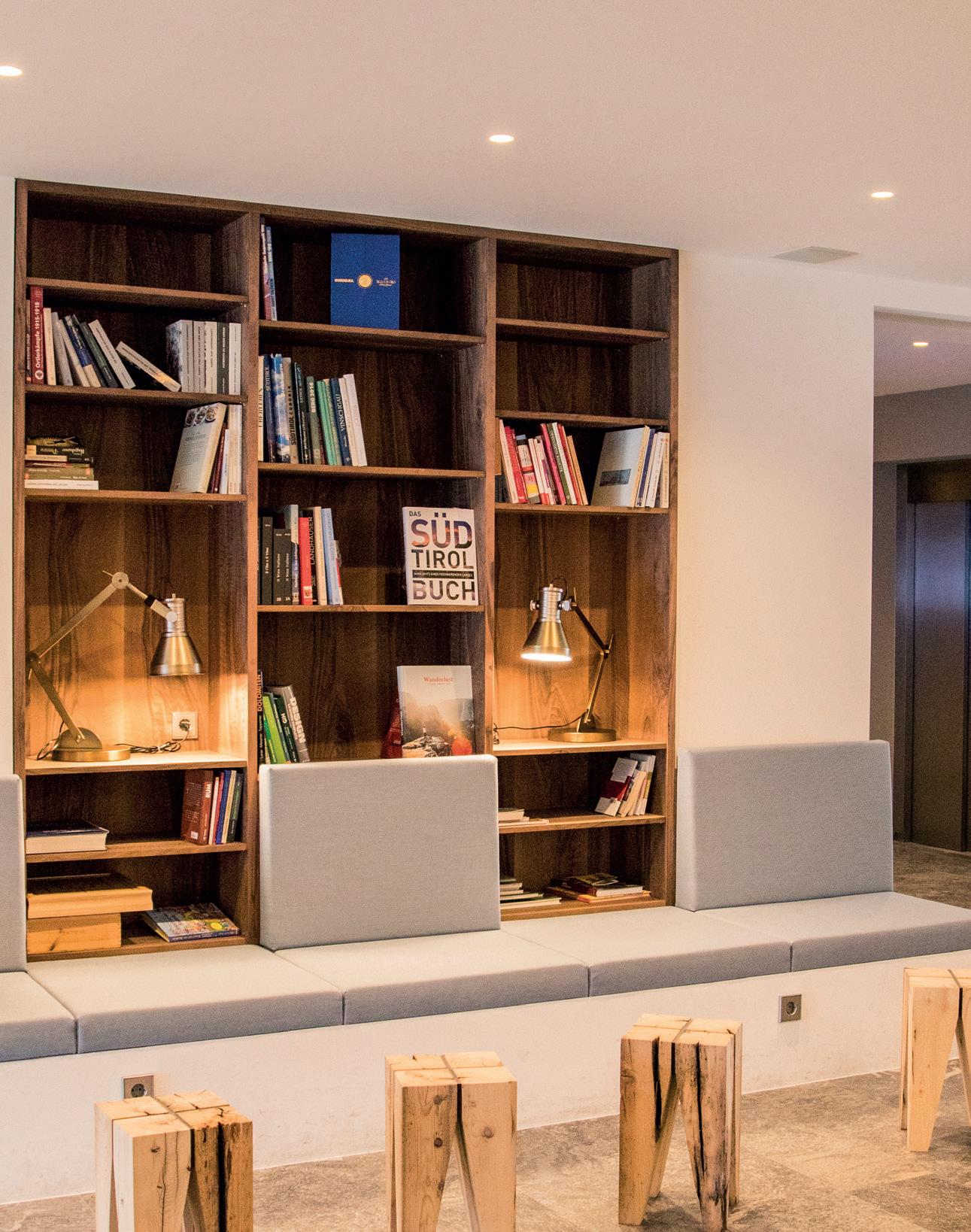 è più ampia e colpisce per la sua struttura a volte bianche, i pilastri di legno a forma di V, il camino scoppiettante, le confortevoli sedute e le poltrone di design che invitano a soffermarsi. Una libreria con guide dell’Alto Adige e libri di viaggio pubblicati da National Geographic riflette in piccolo quel mix di stile alpino e influenze internazionali, tipico di tutti gli spazi dell’albergo. Qui, inoltre, si trovano anche mobili firmati Walter Knoll, Artisan, NV Gallery, Zuiver e di altri rinomati designer. Attraverso le grandi vetrate che inondano il bar di luce naturale, la vista spazia sulla terrazza fino alla facciata dell’albergo, rivolta a sud e di nuova concezione, la quale si fonde con il paesaggio circostante grazie ai pilastri in muratura, alle finestre panoramiche e alla struttura a travi in legno tenue.