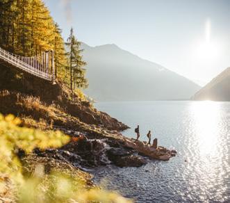 In estate, il lago di Vernago si accende di riflessi dorati e invita a passeggiare lungo un sentiero circolare tra boschi ombrosi e scorci alpini.