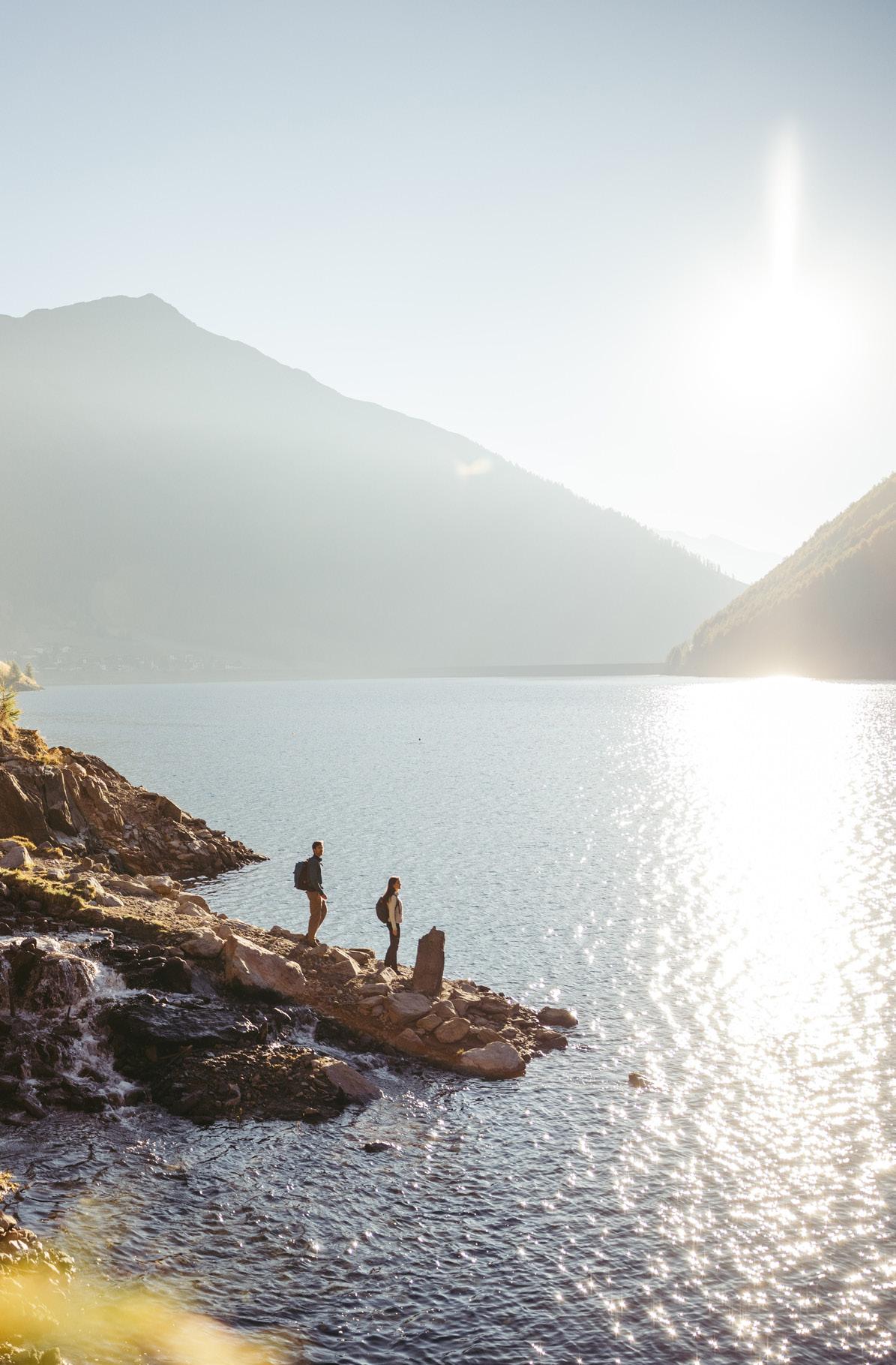 Im Sommer schimmert das Wasser des Vernagt-Stausees golden und kann neben majestätischen Gipfeln bei einer Rundwanderung durch schattige Wälder bewundert werden.