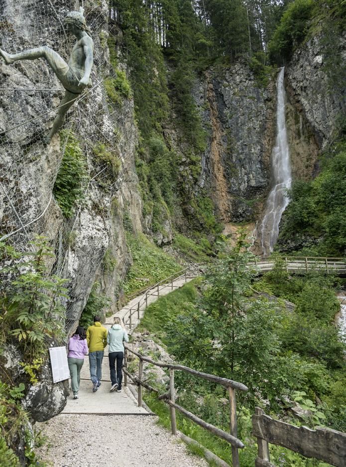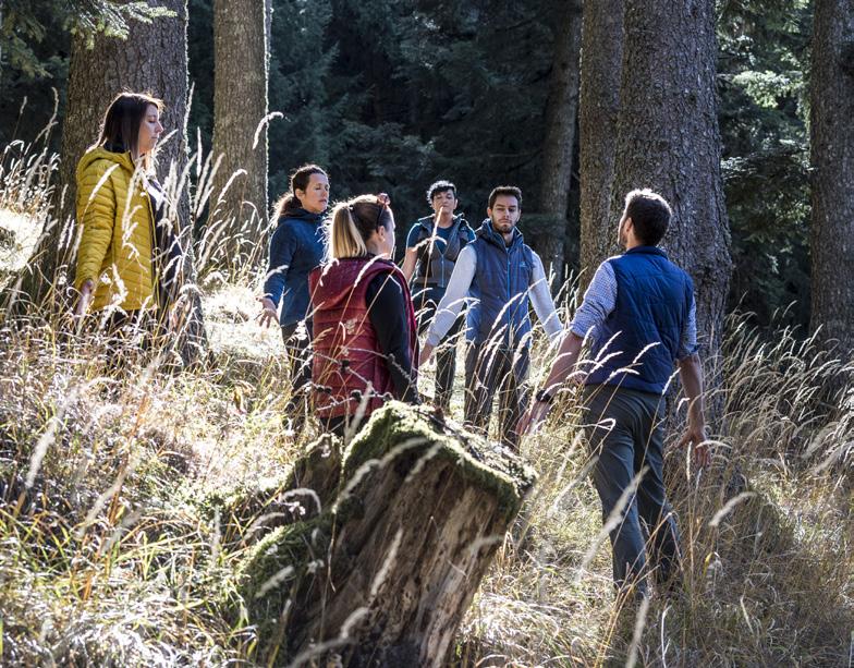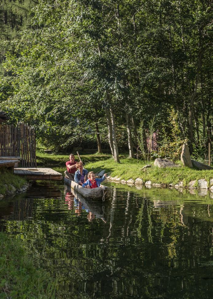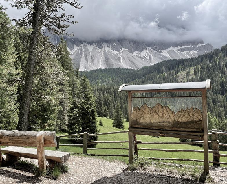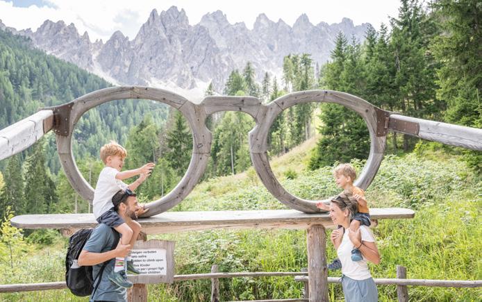 by giant, gnarly trees. A total of 15 interactive stops introduce visitors to the myths and legends of the Dolomites. Thanks to the leisurely circular route and the gentle 90 m elevation gain, the excursion is also suitable for families with pushchairs.